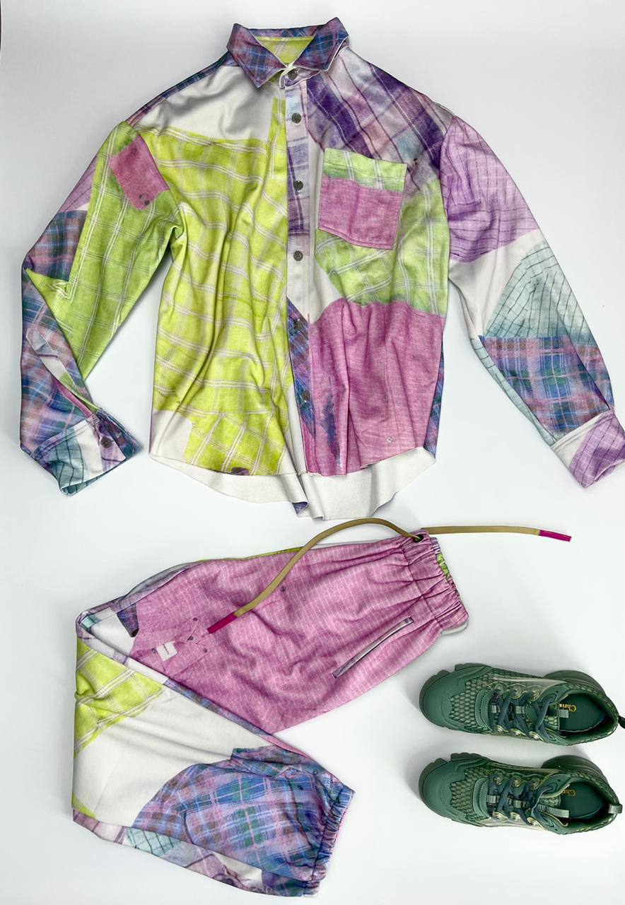 Этот яркий костюм от LUXE-CRIME, артикул LUX-49327, представляет собой смелое сочетание стилей, вдохновленное авангардом и уличной модой. Комплект состоит из рубашки и брюк, выполненных в технике пэчворк, имитирующей различные виды клетчатой ткани в ярких оттенках зеленого, розового, фиолетового и белого. Этот дизайн создает уникальный и запоминающийся образ.