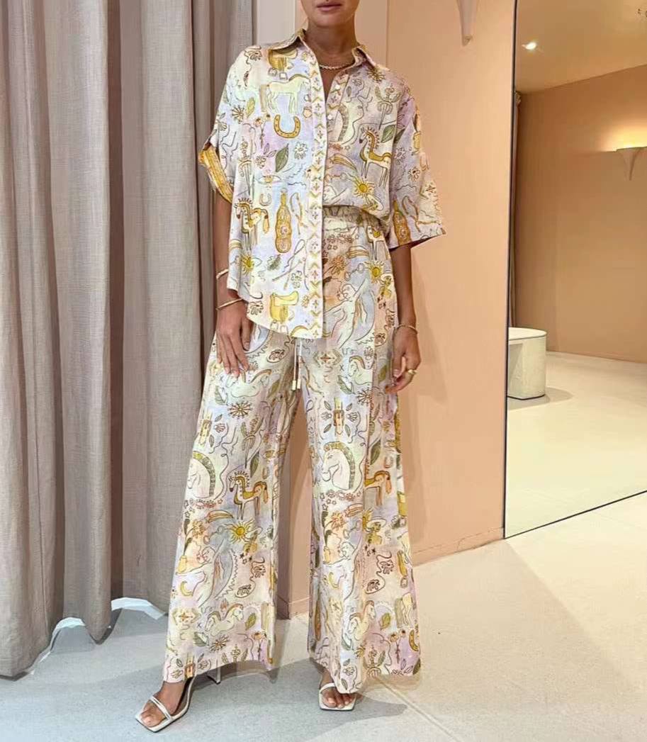 Костюм ALEMAIS LUX-87678 представляет собой комплект в стиле casual, состоящий из рубашки с короткими рукавами и широких брюк с принтом. Комплект выполнен в светлых тонах с яркими элементами принта, создавая легкий и воздушный образ, который подойдет для повседневной носки в теплое время года.