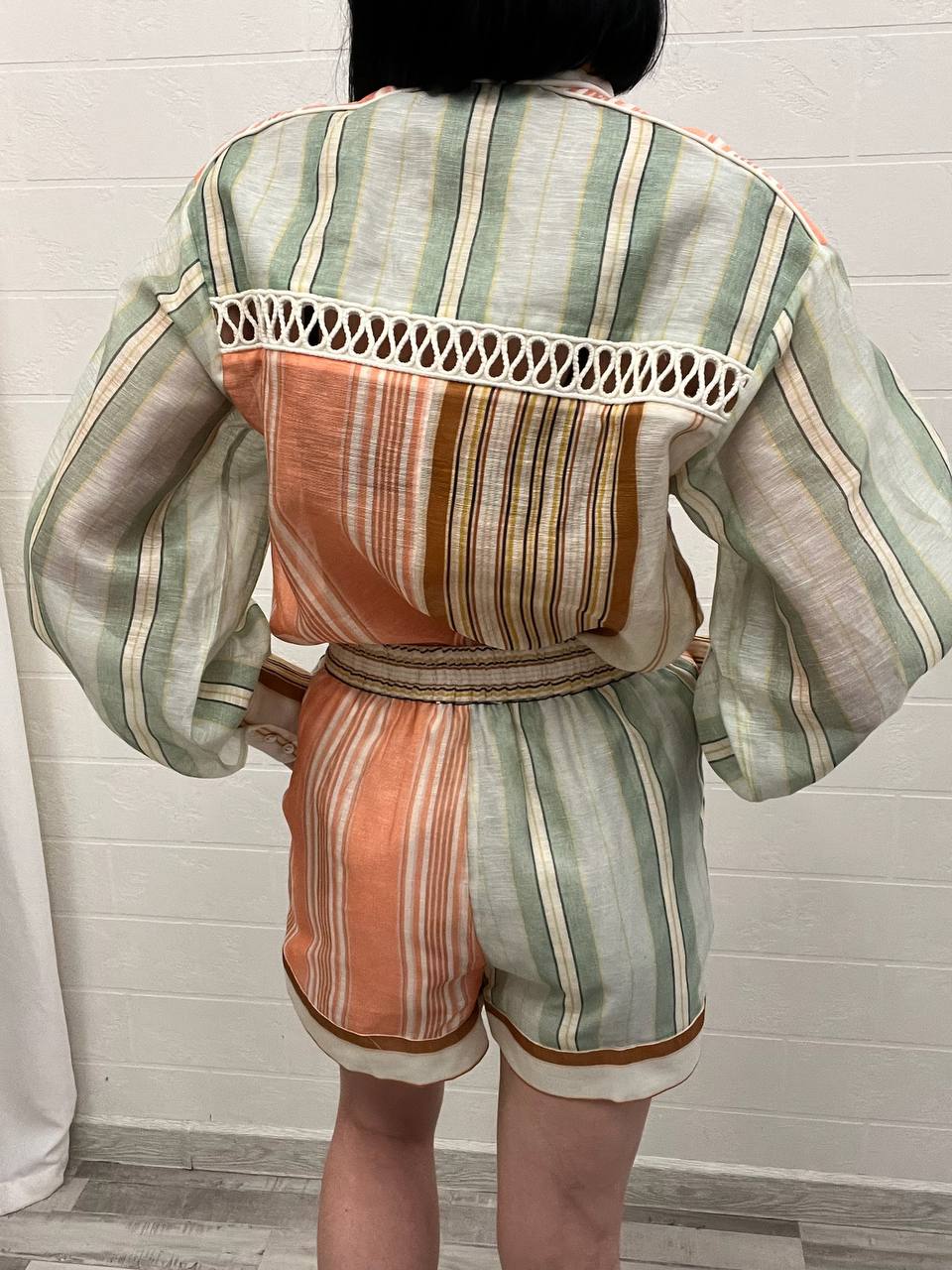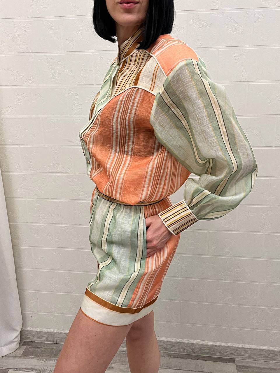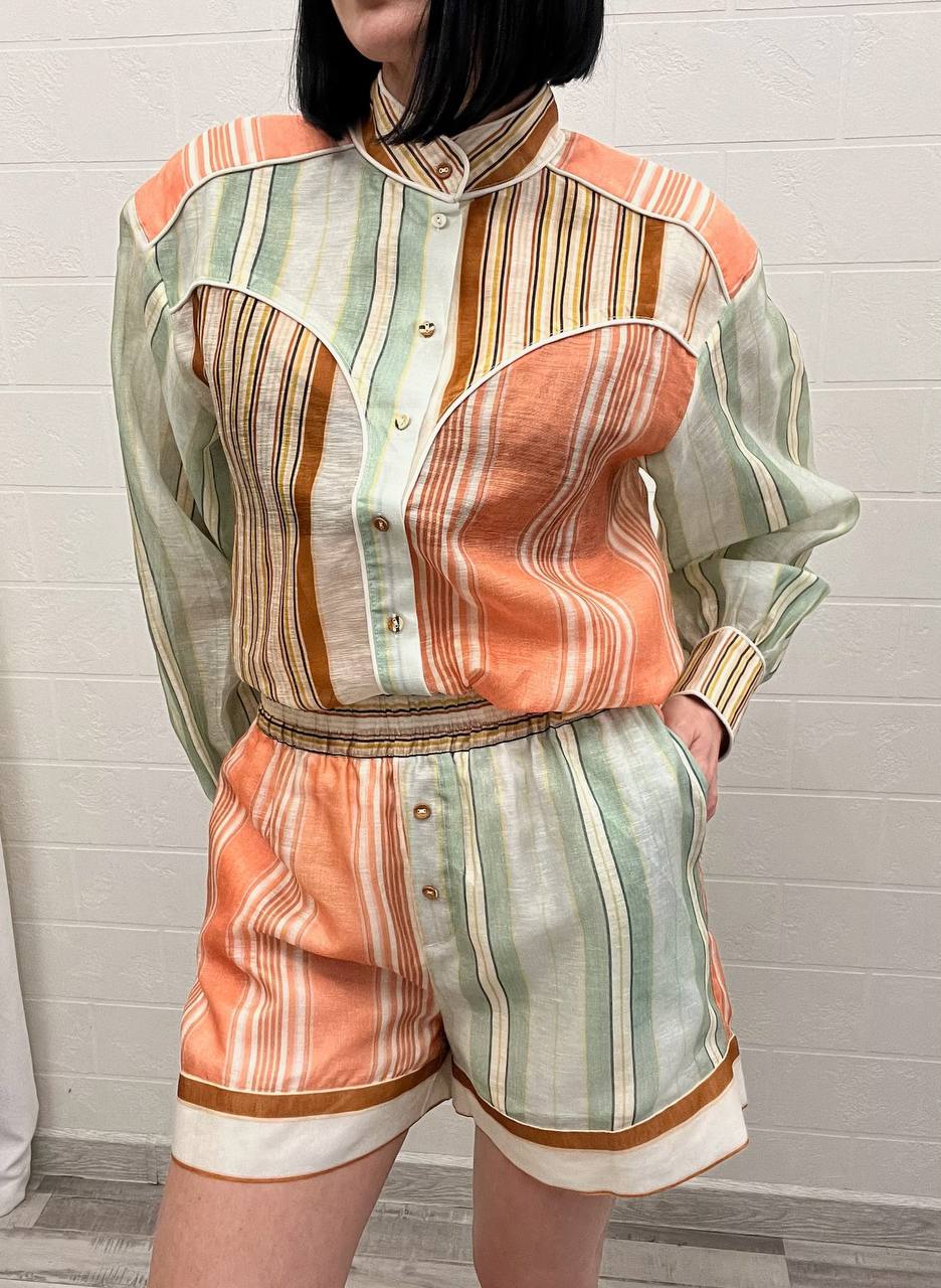 Костюм Antipodean LUX-106137 — это стильный комплект, состоящий из рубашки с длинными рукавами и шорт, выполненный в ярких цветах. Комплект обладает полосатым узором в сочетании оранжевого, мятного, коричневого и белого цветов. Его свободный крой и легкие ткани идеально подходят для создания летнего образа.