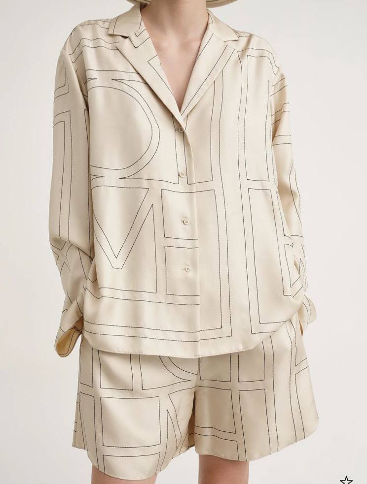 Костюм из шелка Toteme LUX-86787 - это воплощение элегантности и комфорта. Комплект состоит из рубашки и шорт в кремовом оттенке с контрастным геометрическим принтом. Идеален для создания расслабленного, но стильного образа.