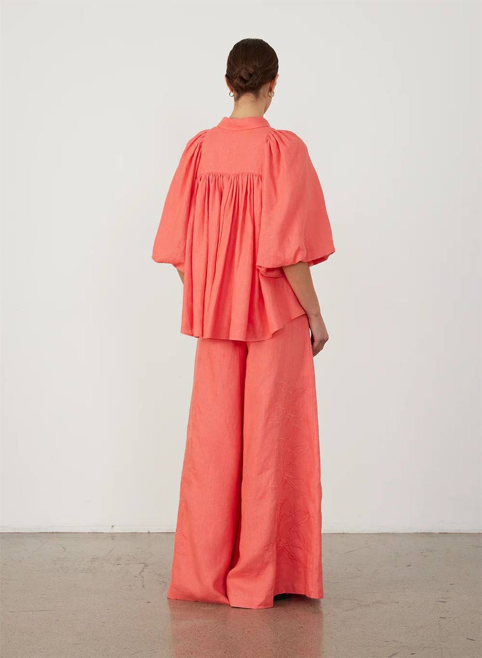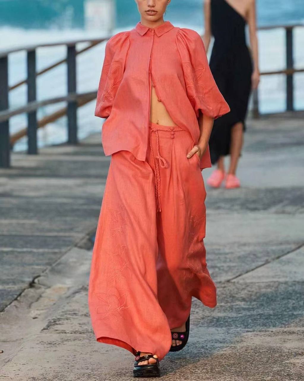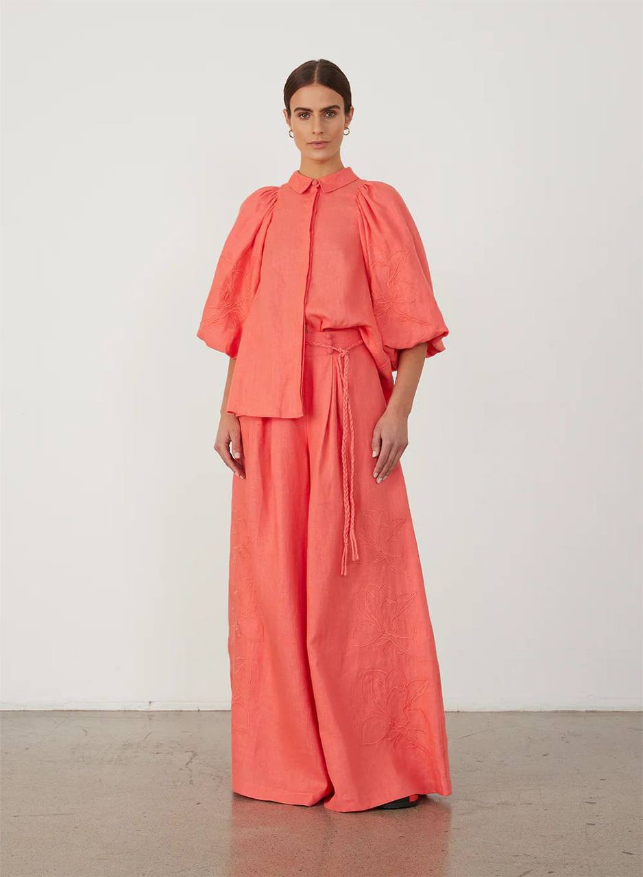 Костюм Joslin, LUX-106140 – это комплект в расслабленном стиле, выполненный в коралловом оттенке. Комплект состоит из свободной рубашки с короткими рукавами и широких брюк с высокой посадкой, дополненных деталями в виде вышивки. Идеально подойдет для создания стильного и комфортного образа на каждый день или для особых случаев.