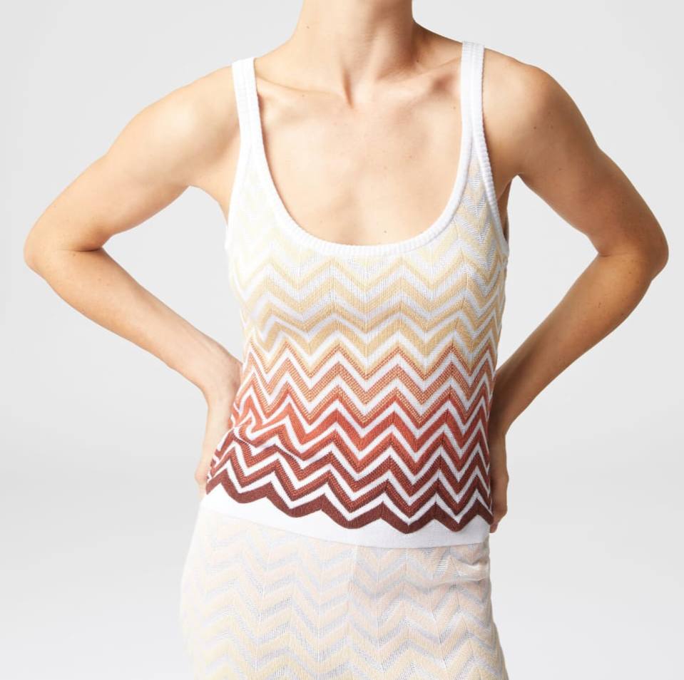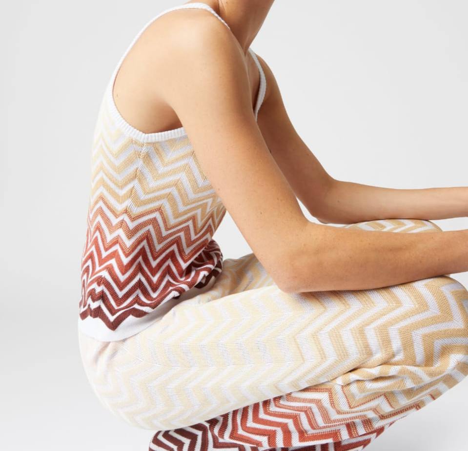 Костюм Missoni LUX-114801 — это стильный комплект, который сочетает в себе элегантность и комфорт. Он состоит из топа-майки и брюк с фирменным зигзагообразным узором, который придает образу динамичность. Комплект идеально подходит для создания летних образов.