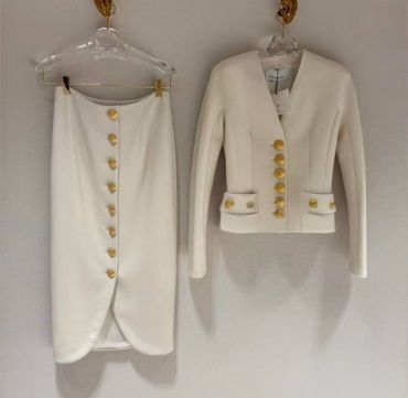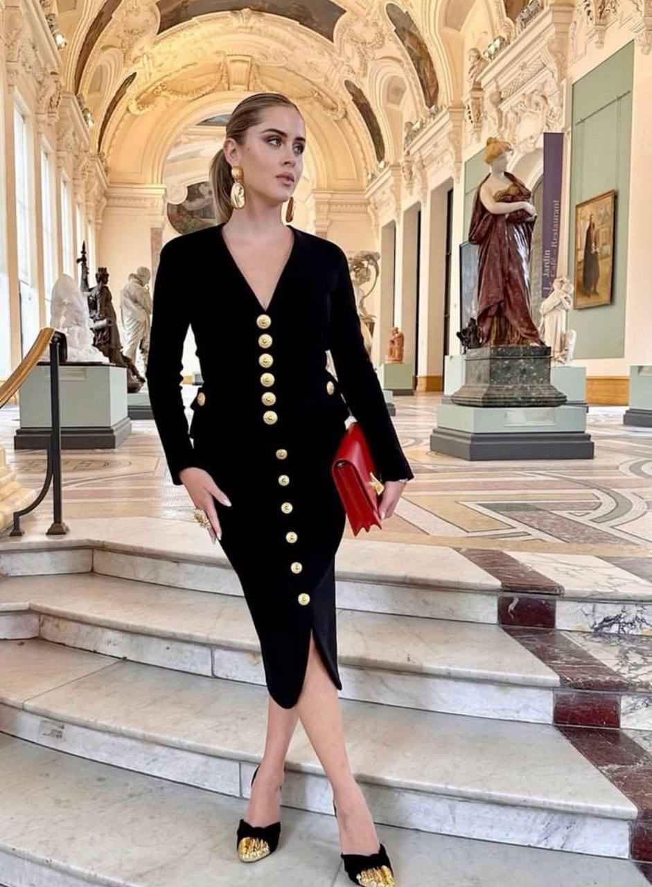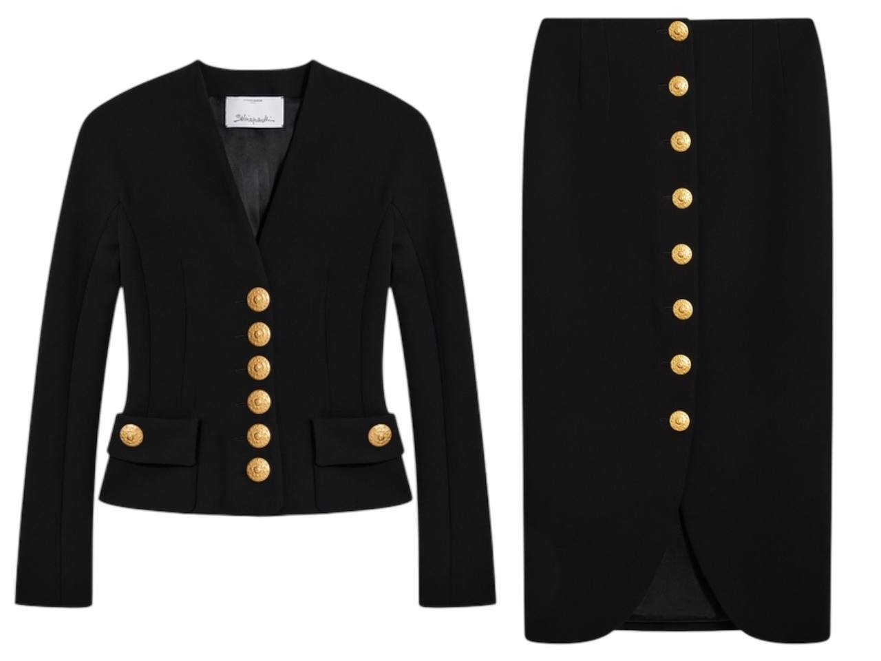 Костюм Schiaparelli LUX-119449 — это элегантное платье-футляр черного цвета с длинными рукавами и глубоким V-образным вырезом. Платье украшено золотыми пуговицами, расположенными вдоль всей длины, что добавляет ему изысканности. Этот наряд идеально подойдет для торжественных мероприятий и светских выходов.