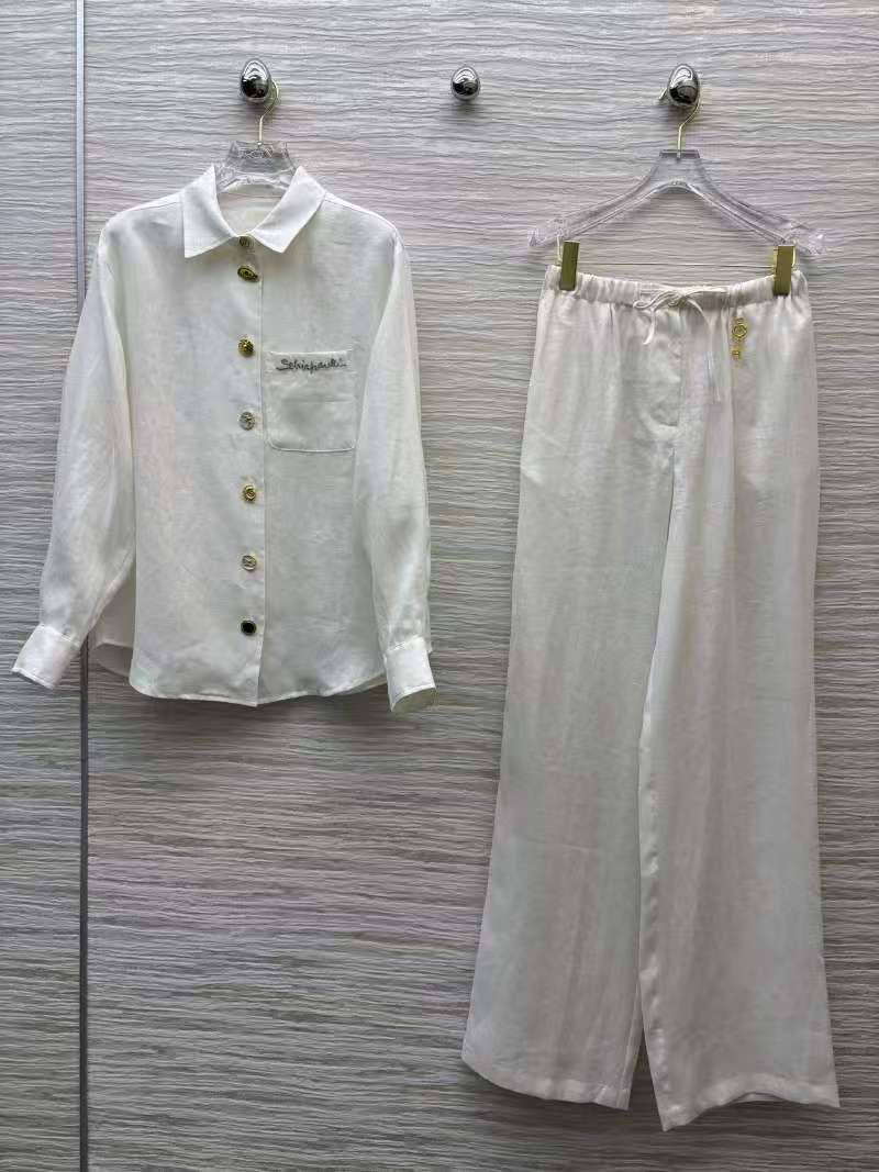 Костюм Schiaparelli LUX-119772 – это элегантный и стильный ансамбль. Белый костюм состоит из рубашки с длинными рукавами и прямых брюк. Нежная текстура ткани придает образу легкость и изысканность, а свободный крой обеспечивает комфорт в течение всего дня.