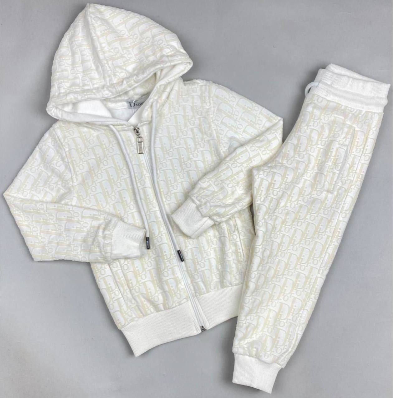 Костюм спортивный Christian Dior LUX-80529 – это стильный и комфортный спортивный костюм, выполненный в узнаваемом стиле бренда. Он представлен в белом цвете с характерным узором логотипа по всей поверхности, что придает ему элегантный вид. Этот костюм подойдет для повседневной носки, прогулок или занятий спортом.