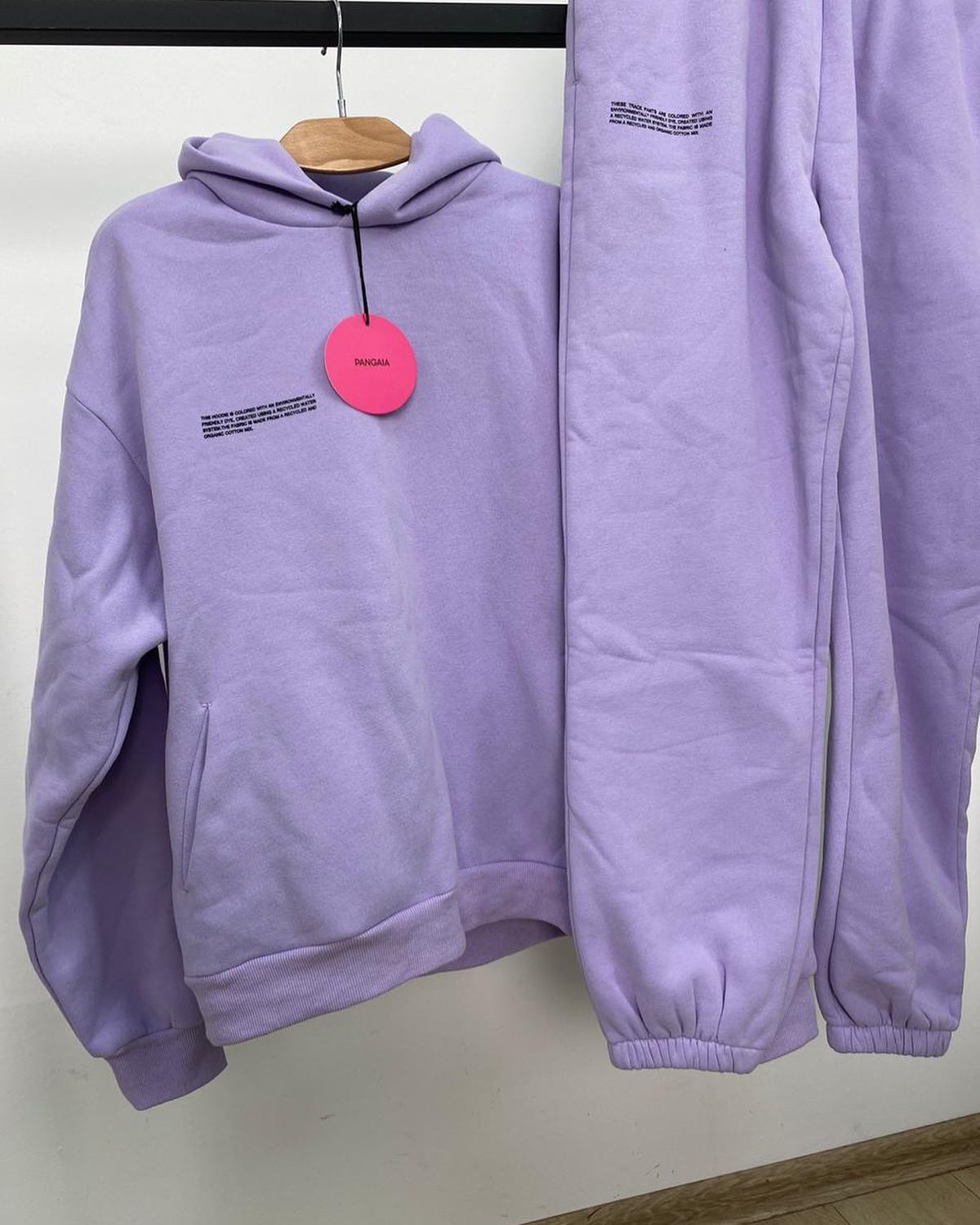 Этот спортивный костюм Pangaia LUХ-35340 выполнен в современном стиле, сочетающем комфорт и осознанный подход к производству. Комплект состоит из худи и брюк, представленных в нежном лавандовом оттенке. Материалы, используемые брендом, ориентированы на экологичность, что подчеркивает стремление к устойчивой моде.