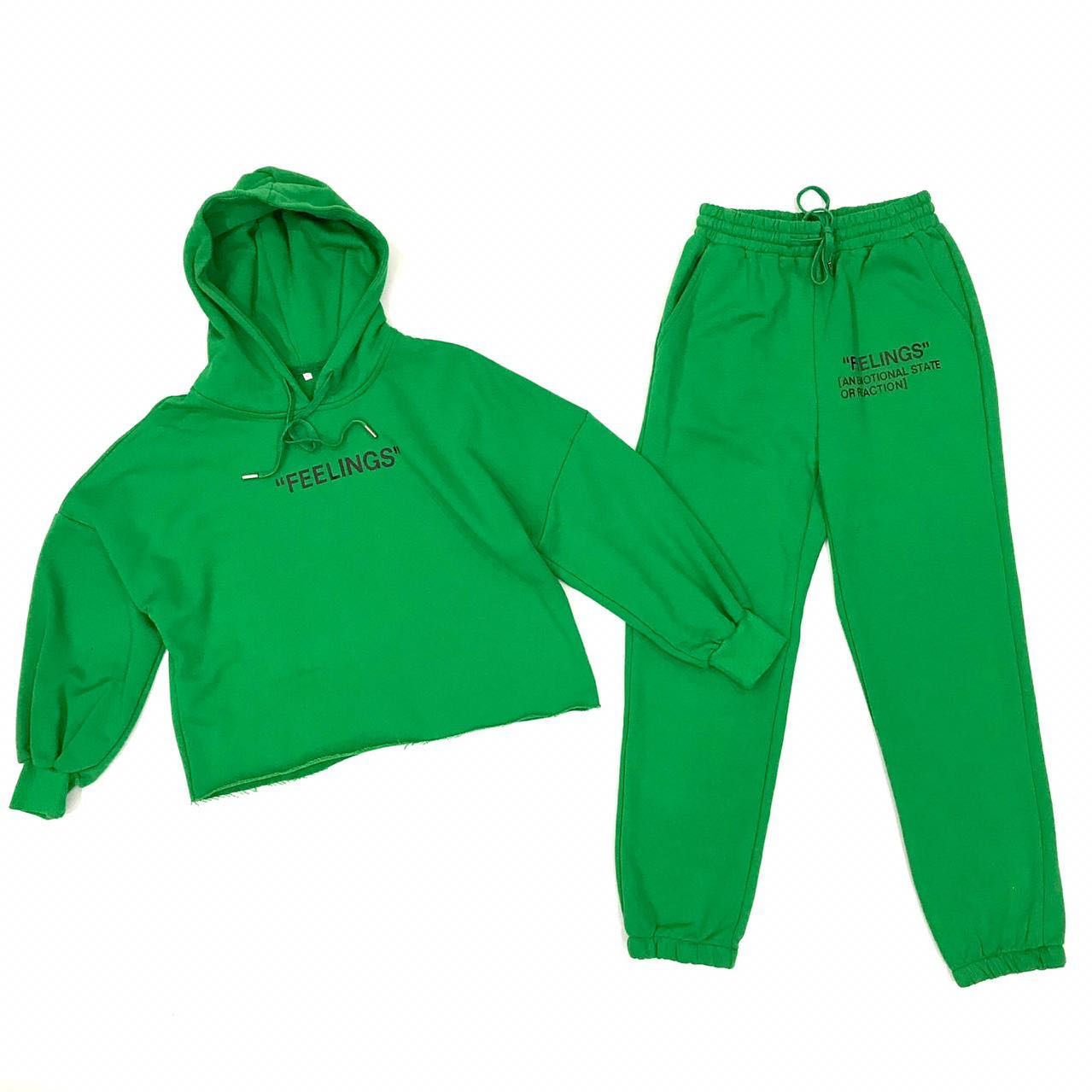 Костюм спортивный LUX-35742 представляет собой стильный комплект, состоящий из укороченного худи и брюк. Модель выполнена в ярком зеленом цвете и украшена черными принтами с надписями "FEELINGS" и "EMOTIONAL STATE OR ACTION", подчеркивающими современный дизайн. Этот костюм идеально подходит для создания расслабленных, но модных образов.