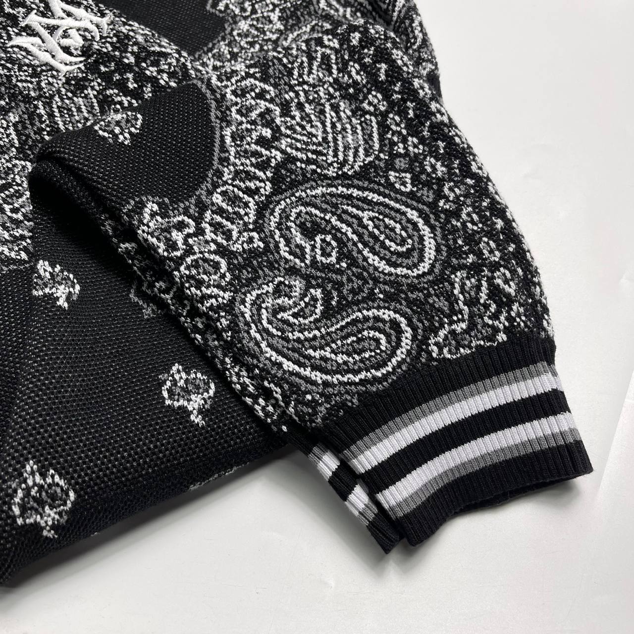 Костюм спортивный Amiri LUX-83127 - это стильный комплект для повседневной носки, который сочетает в себе комфорт и современный дизайн. Костюм выполнен в черно-белой гамме с узнаваемым узором пейсли. Отлично подойдет для создания эффектных образов в стиле casual.