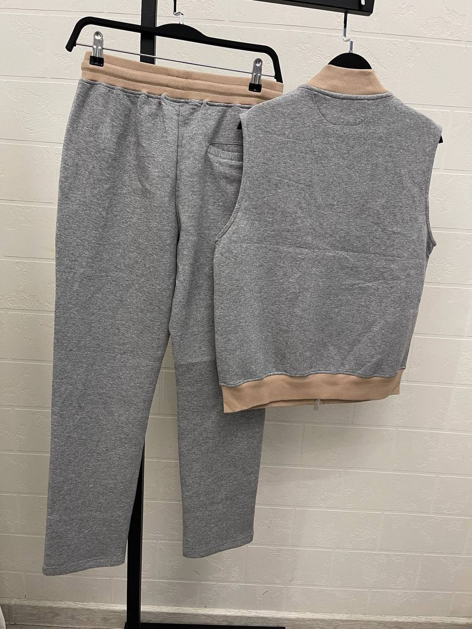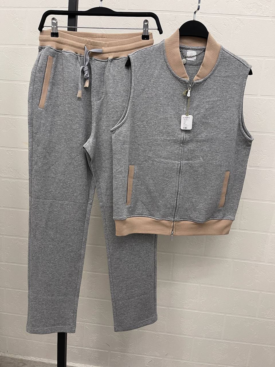 Костюм спортивный Eleventy LUX-110587 представляет собой стильный комплект из жилетки и спортивных брюк. Комплект выполнен в сером цвете с контрастными бежевыми деталями. Этот костюм идеально подходит для создания комфортных и модных образов.