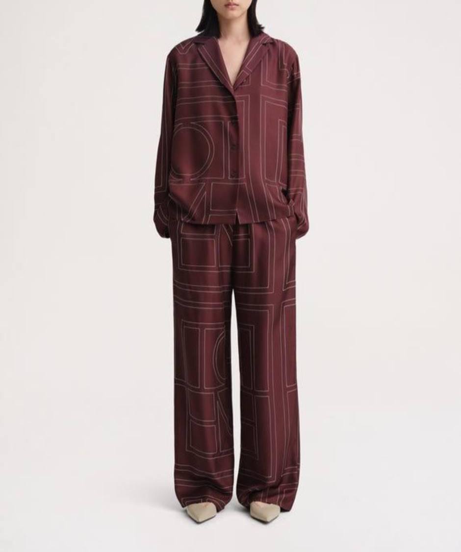 Костюм Toteme LUX-119715 — это элегантный комплект в стиле повседневной роскоши. Он выполнен в бордовом цвете с геометрическим принтом, придающим образу современный вид. Костюм состоит из рубашки с длинными рукавами и свободных брюк, идеально подходящих для создания комфортного и стильного образа.