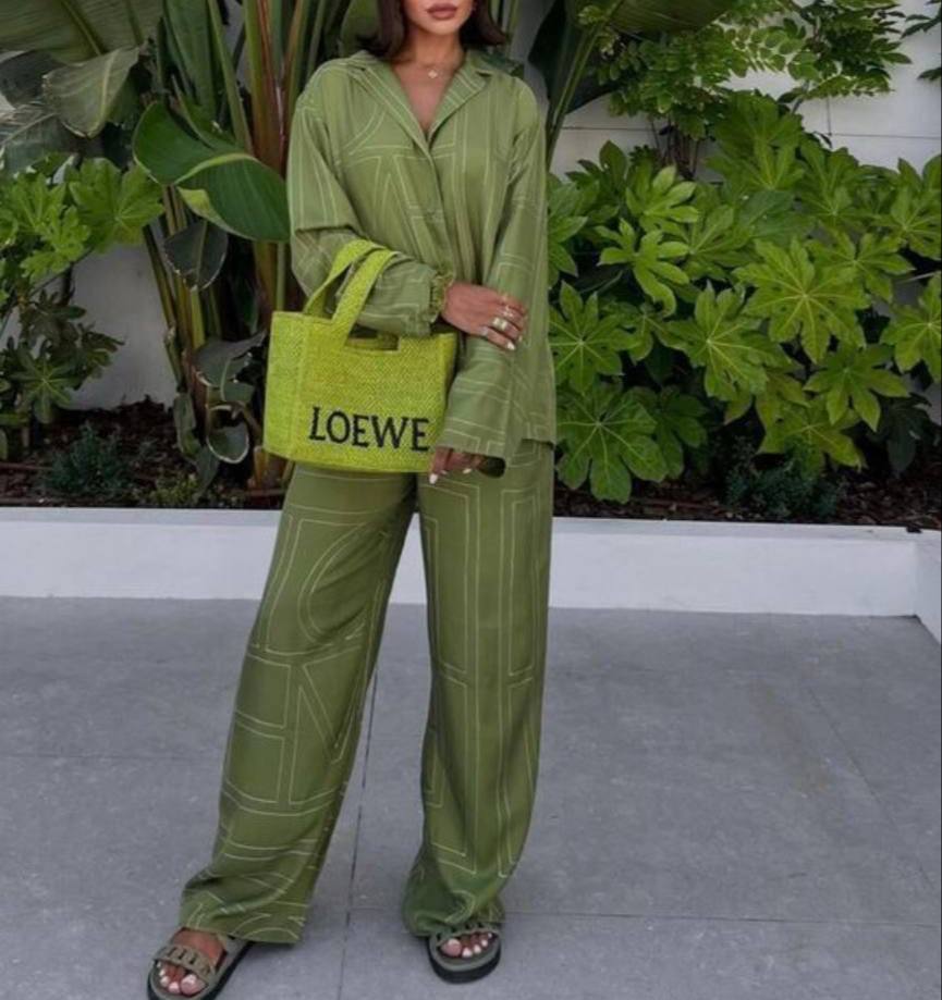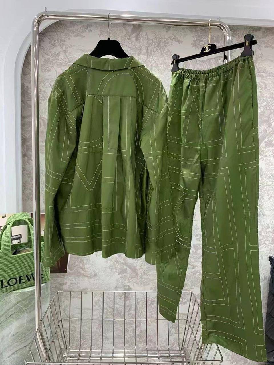 Костюм Toteme LUX-119716 представляет собой стильный комплект в повседневном стиле. Костюм выполнен в цвете хаки, имеет свободный крой, дополнен контрастным белым геометрическим узором. Идеально подходит для создания расслабленных, но элегантных образов.