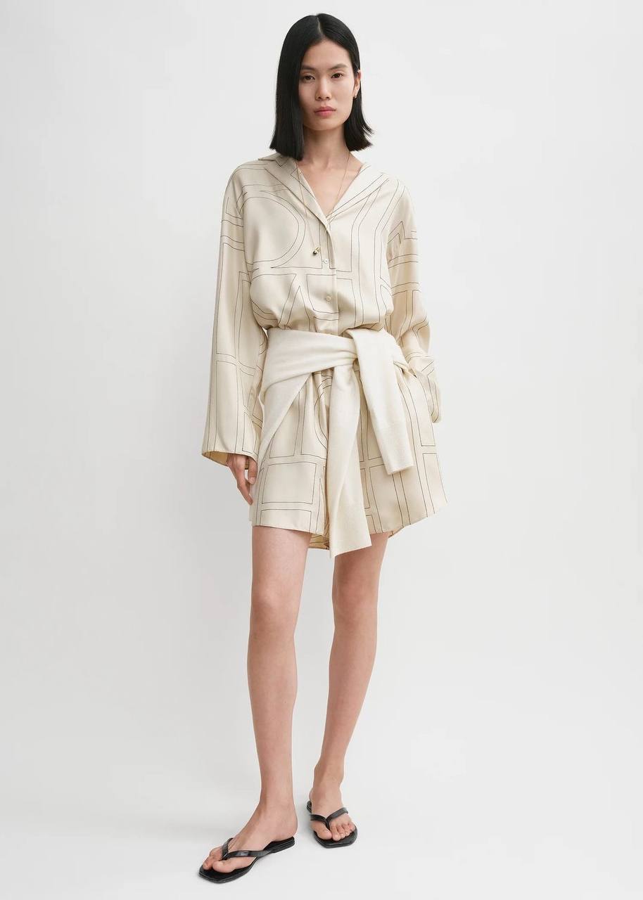 Костюм Toteme LUX-122776 представляет собой стильный комплект, состоящий из рубашки с длинными рукавами и шорт. Этот костюм отличается своим оригинальным дизайном с геометрическим принтом и свободным кроем, что придает образу легкость и непринужденность.