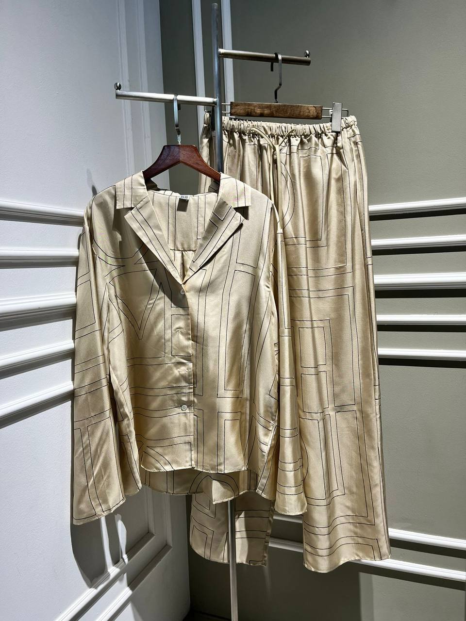 Костюм Toteme LUX-89958 - это элегантный ансамбль, который состоит из рубашки с воротником и прямых брюк. Комплект выполнен в кремовом оттенке с геометрическим черным принтом. Такой костюм подойдет для создания стильных повседневных и офисных образов.