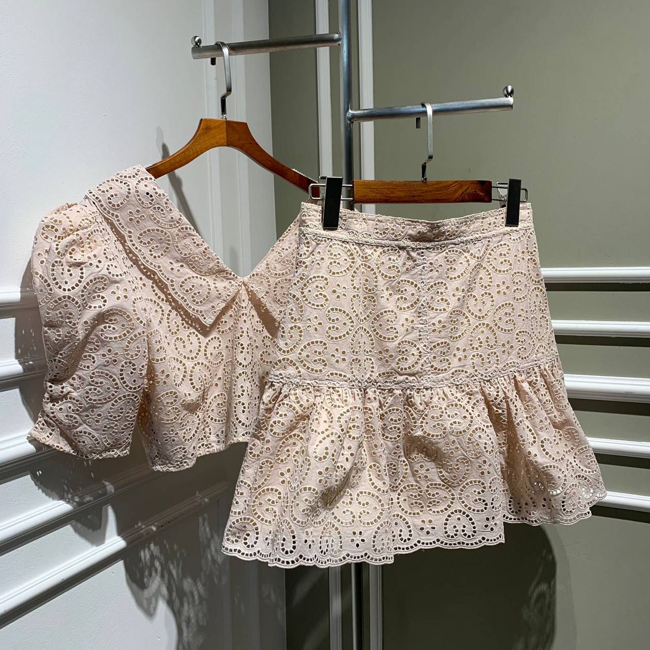 Представляем изысканный женский костюм LUX-67081 от бренда LUX, выполненный в нежном пудровом оттенке. Этот комплект, состоящий из укороченного топа с объемными рукавами и отложным воротником, а также юбки с рюшами, отличается утонченным кружевным узором. Идеальный выбор для создания романтичных и элегантных образов.