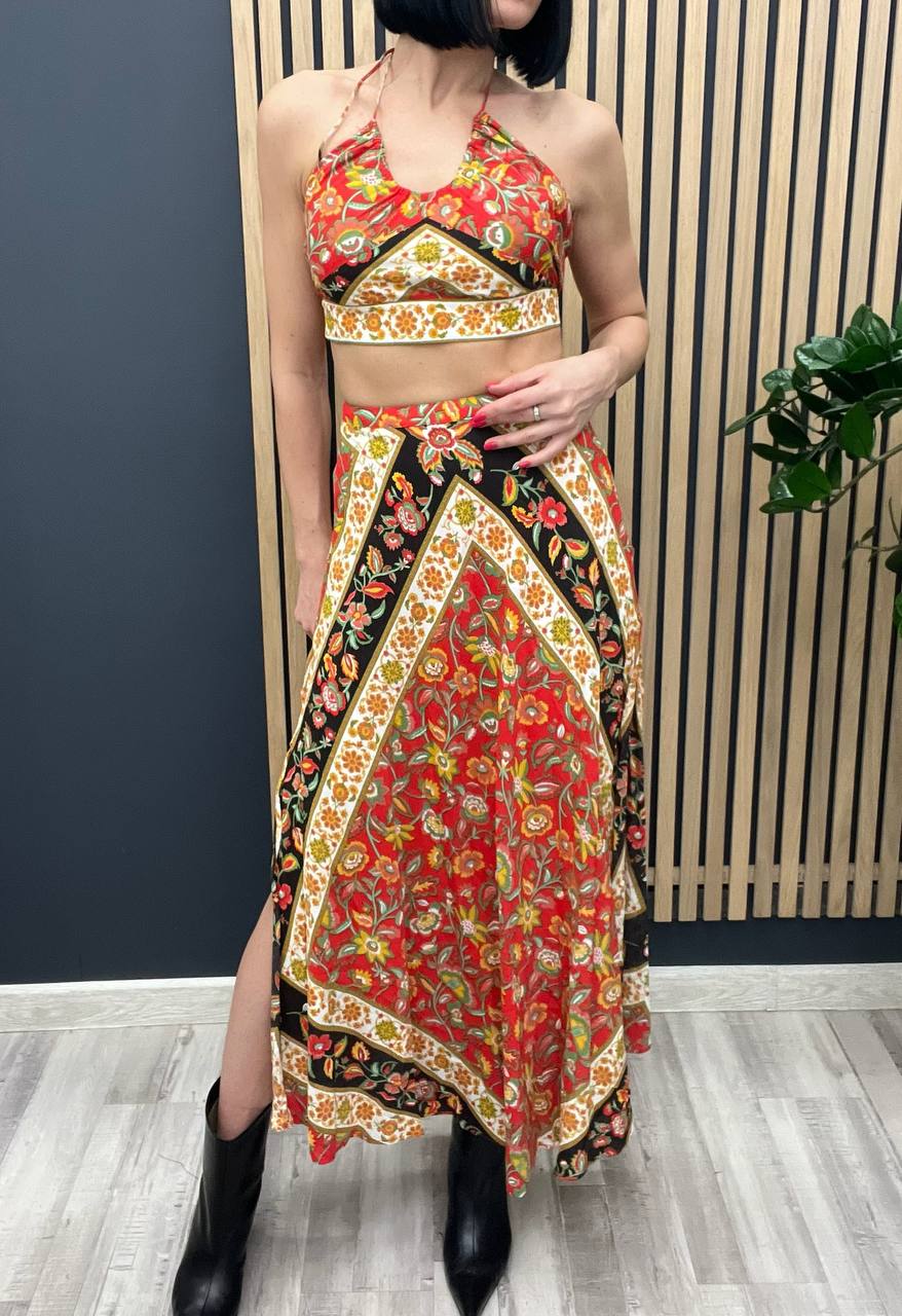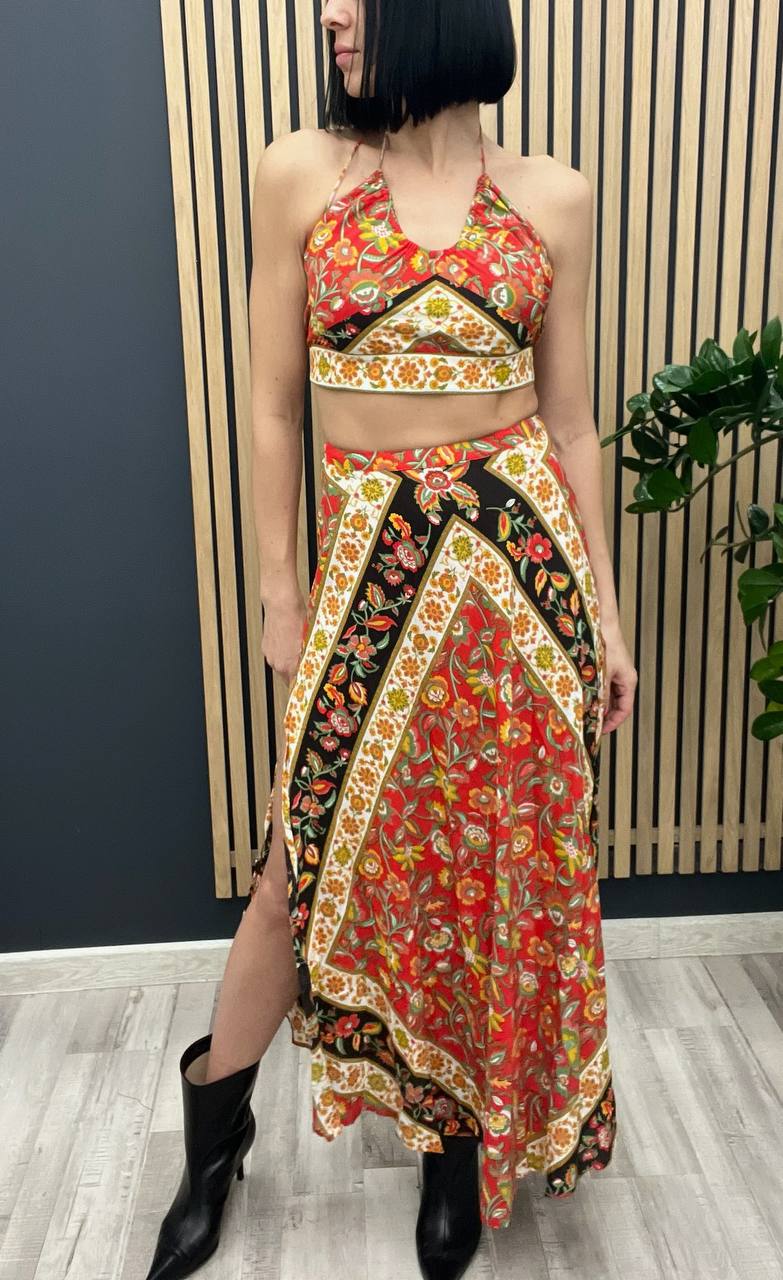 Костюм женский LUX-104379 — это яркий и стильный наряд, состоящий из топа и юбки в пол. Комплект выполнен в красочном цветочном принте, который добавляет образу женственности и легкости. Такой костюм идеально подойдет для создания летних образов, подчеркивая индивидуальность и стиль.