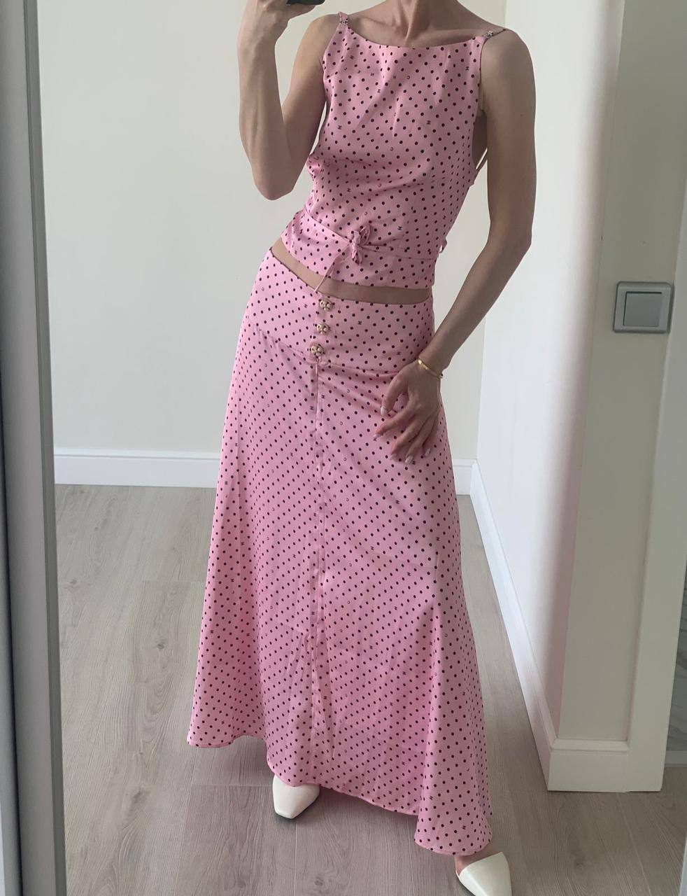 Костюм женский LUX-105852 – это элегантный комплект, состоящий из топа и юбки в романтичном стиле. Костюм выполнен в нежно-розовом цвете с черным горошком. Идеально подходит для создания женственных и стильных образов.