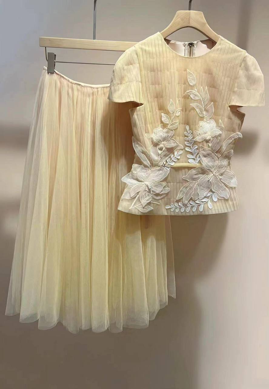 Костюм женский LUX-107078 — элегантный комплект, который состоит из топа и юбки. Комплект выполнен в светлых тонах с нежной текстурой ткани и объемной вышивкой. Юбка легкая, струящаяся. Данный костюм подойдет для создания изысканных образов.