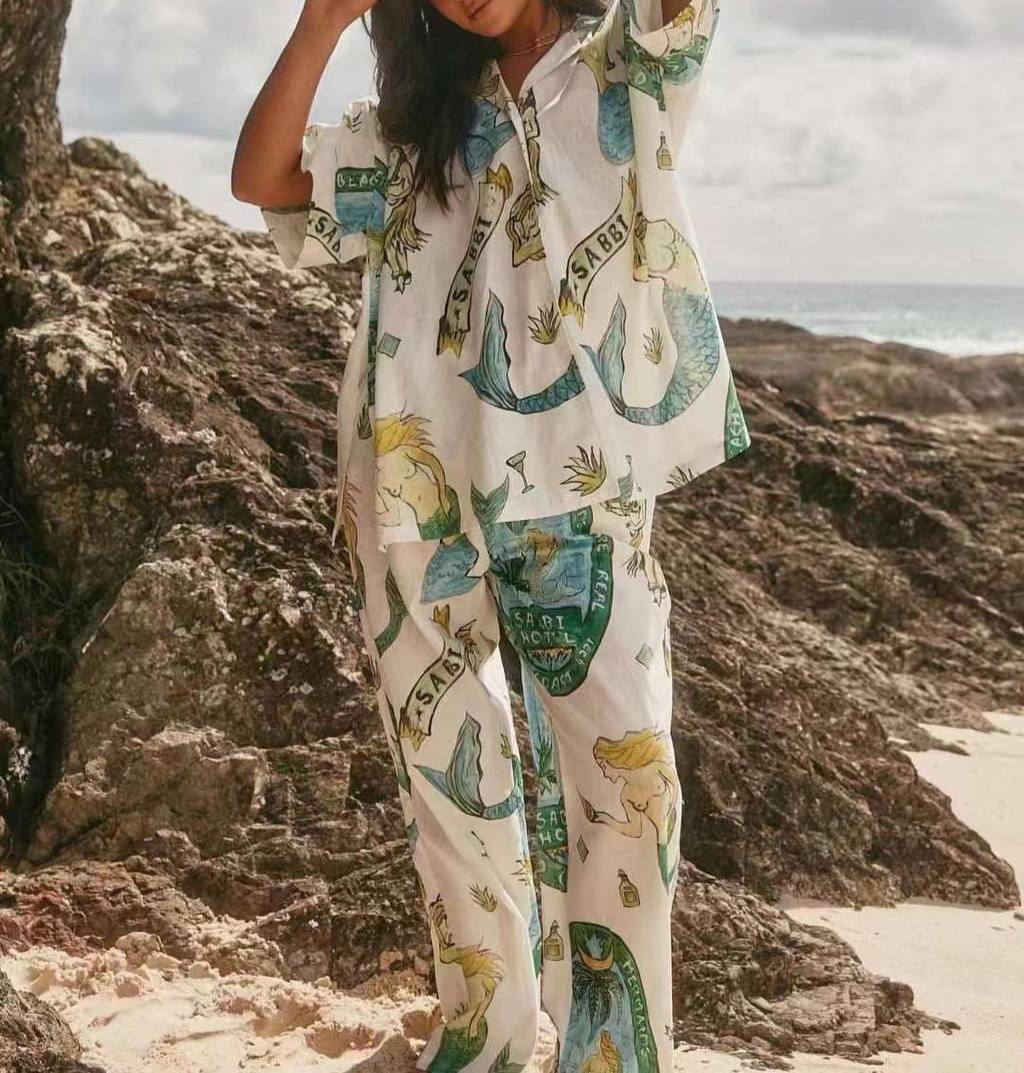 Костюм женский Alemais LUX-108457 представляет собой стильный комплект в морской тематике. Он состоит из рубашки с короткими рукавами и брюк прямого кроя, выполненных в белом цвете с ярким принтом с изображением русалок и надписей. Этот костюм подойдет для создания эффектных образов на отдыхе или в повседневной жизни.