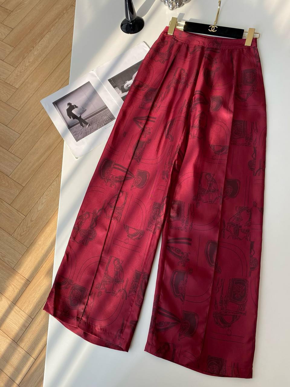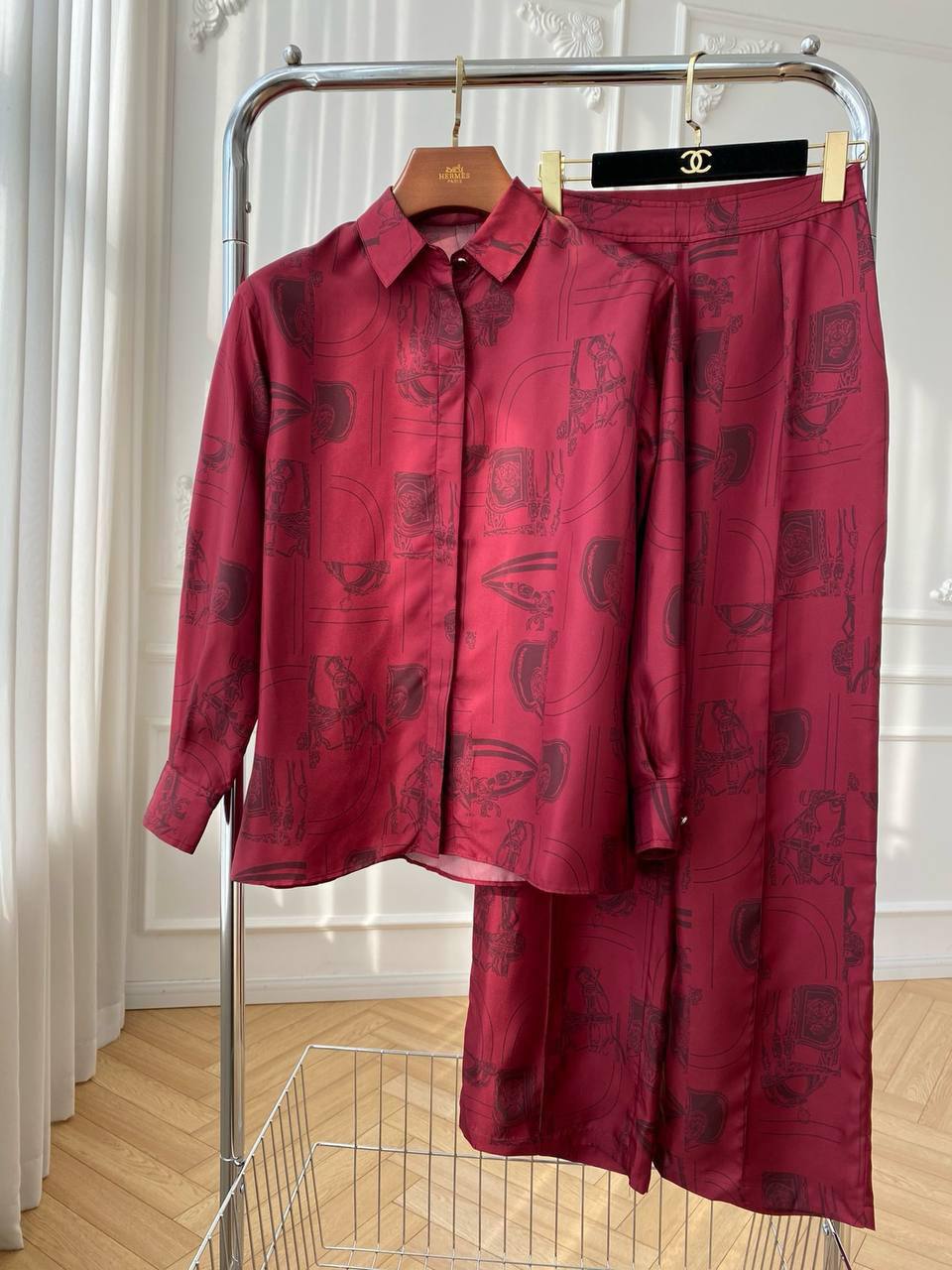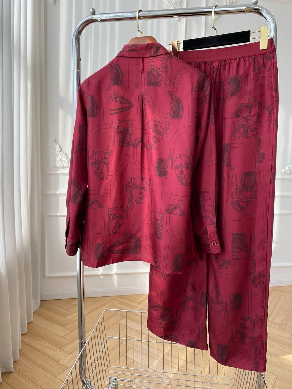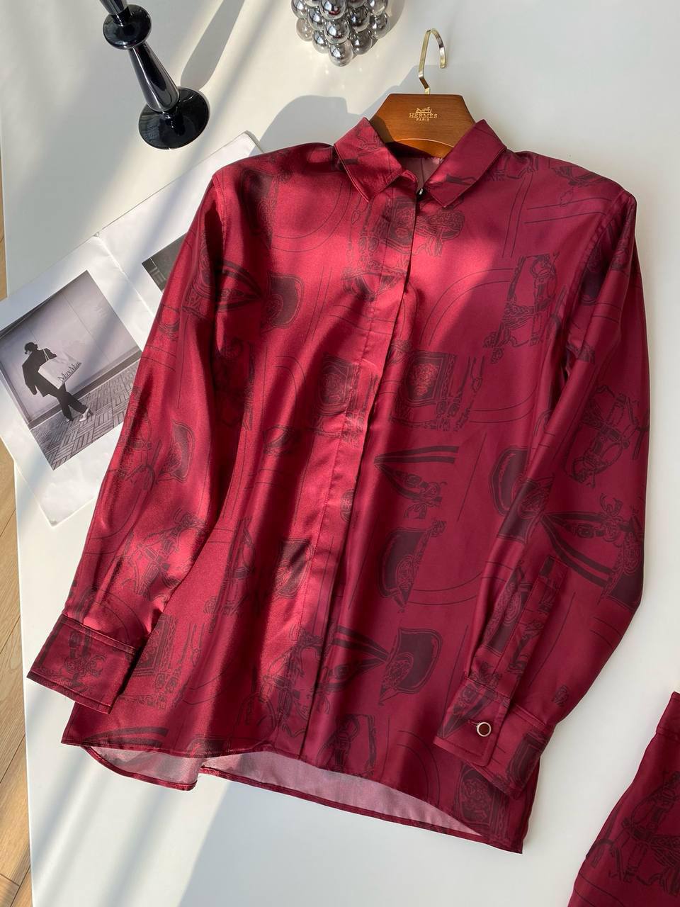 Костюм женский LUX-110779 представлен в элегантном стиле. Он выполнен в насыщенном бордовом цвете с интересным принтом, который добавляет образу изысканности. Костюм состоит из рубашки с длинными рукавами и прямых брюк, подходящий для различных событий.