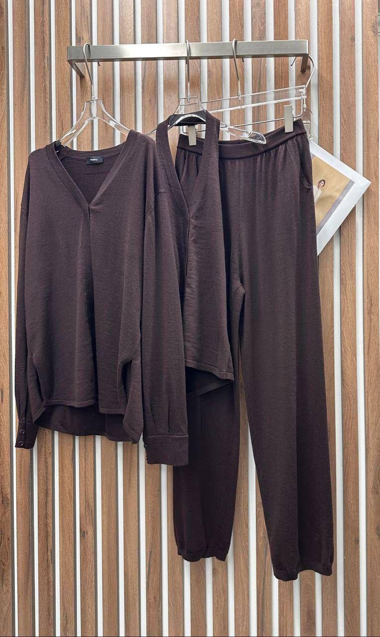Женский костюм LUX-115967 – это стильный ансамбль для создания элегантных образов. Комплект состоит из джемпера с V-образным вырезом, топа и брюк. Костюм выполнен в сдержанном коричневом цвете, что делает его универсальным и подходящим для различных ситуаций.