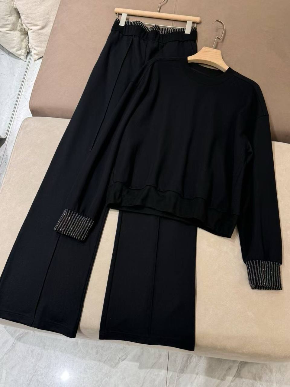 Костюм женский LUX-117246 – это стильный комплект, включающий в себя свитер и брюки. Чёрный цвет костюма придает ему элегантность и универсальность, а прямой крой брюк создает современный силуэт. Этот костюм идеально подойдет для создания образов в стиле casual и smart casual.