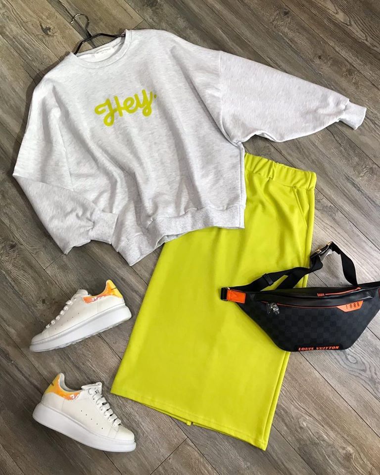 Костюм женский LUX-29538 от бренда LUXE, представленный в виде серого свитшота с принтом "Hey" и ярко-желтой юбки, является воплощением современного уличного стиля. Комплект идеально подходит для создания расслабленных, но трендовых образов.