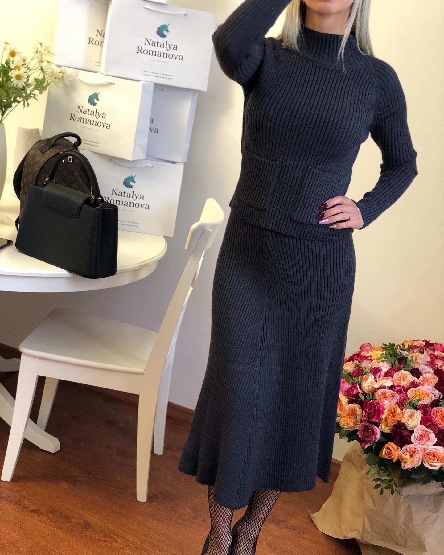 Этот женский костюм от Natalya Romanova выполнен в элегантном стиле, сочетающем в себе комфорт и утонченность. Костюм состоит из джемпера с высоким воротником и юбки миди, создавая гармоничный и современный образ. Он идеально подходит для создания как повседневных, так и более формальных ансамблей, подчеркивая изящество фигуры.