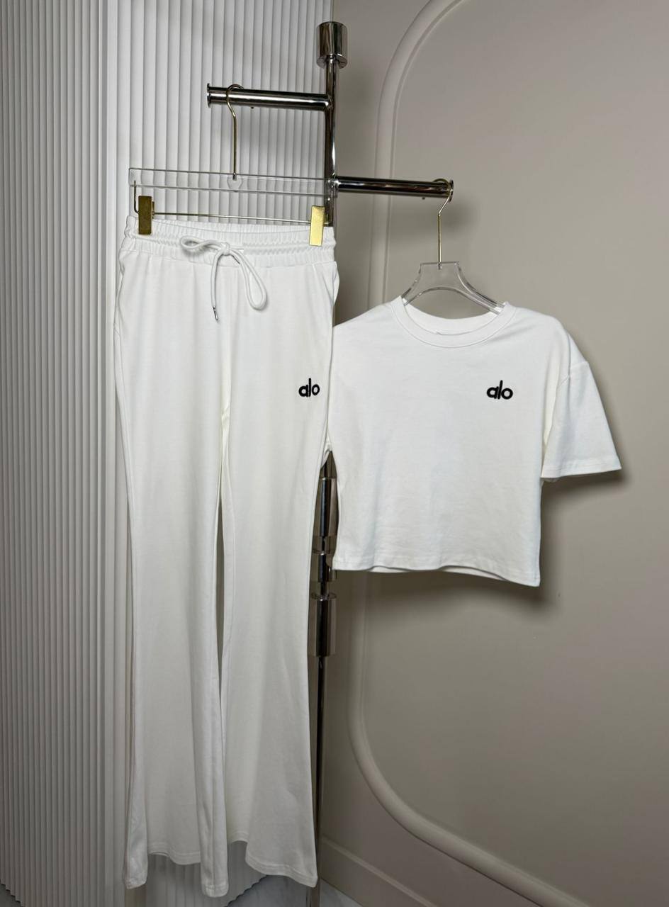 Костюм женский Alo LUX-119364 представляет собой спортивный комплект, состоящий из укороченной футболки и брюк. Выполнен в белом цвете, с минималистичным дизайном и логотипом бренда. Этот костюм подойдет для повседневной носки, занятий спортом или создания стильного образа в стиле casual.
