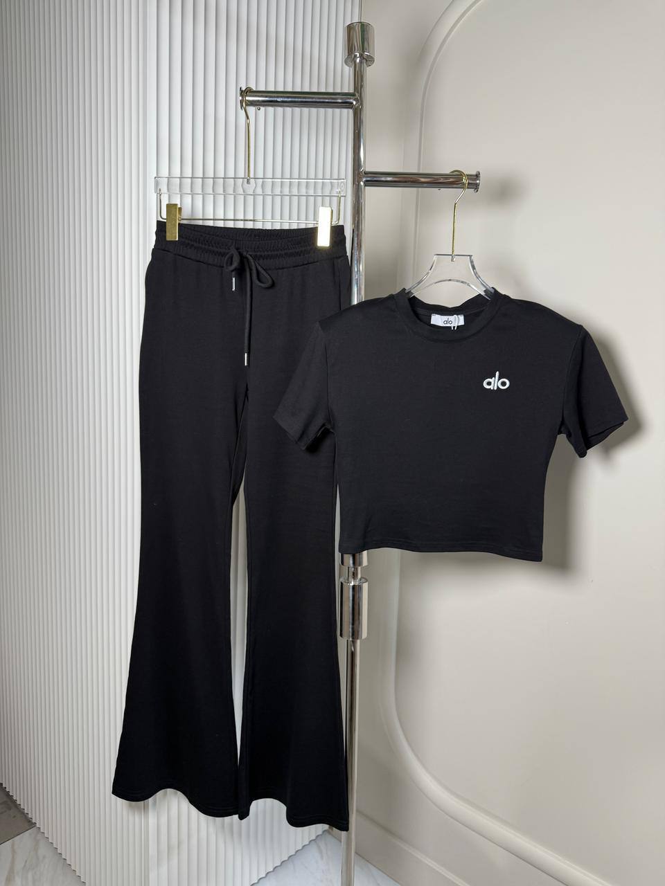 Костюм женский Alo LUX-119366, представленный на изображении, – это стильный спортивный костюм для женщин в черном цвете. Он состоит из короткой футболки с небольшим логотипом и расклешенных брюк с высокой талией. Костюм предназначен для создания комфортного и модного образа.