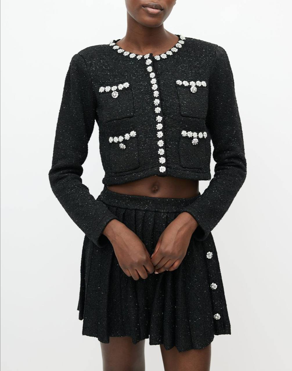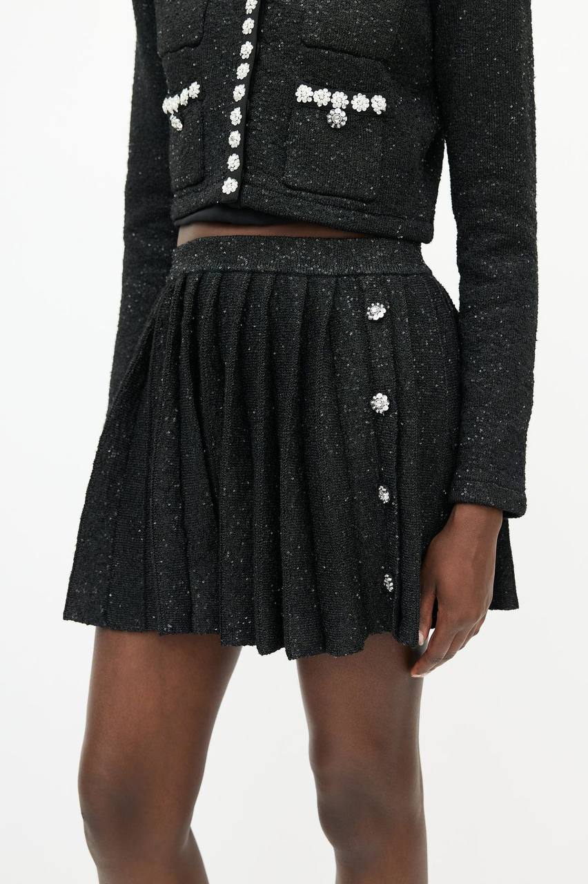 Костюм женский Self-Portrait LUX-100150 представляет собой элегантный комплект, который сочетает в себе изысканность и современный стиль. Комплект состоит из укороченного жакета и плиссированной юбки, выполненных в черном цвете. Этот костюм идеально подходит для создания утонченного и запоминающегося образа.