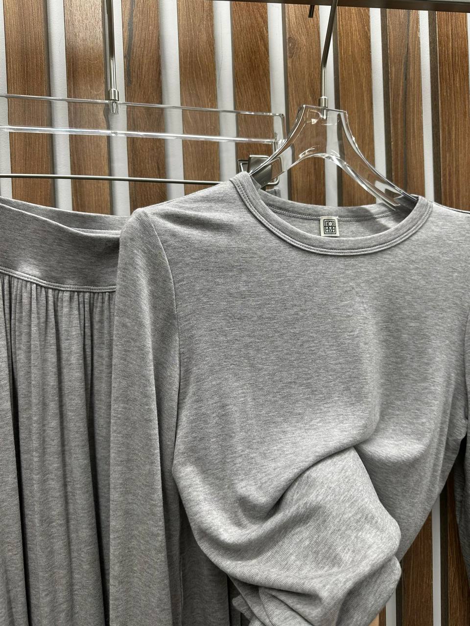 Костюм женский TOTEME LUX-105311 — это стильный ансамбль, сочетающий в себе элегантность и комфорт. Он состоит из кофты с длинными рукавами и длинной юбки. Серый цвет и мягкая текстура ткани делают его универсальным для различных ситуаций.