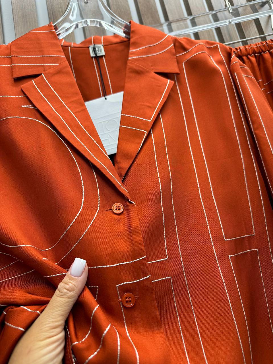 Костюм женский Toteme LUX-108639 - это стильный и современный костюм, который подчеркнет вашу индивидуальность. Он выполнен в ярком оранжевом цвете с белым геометрическим принтом и состоит из рубашки и брюк. Этот костюм прекрасно подойдет для создания эффектных образов.