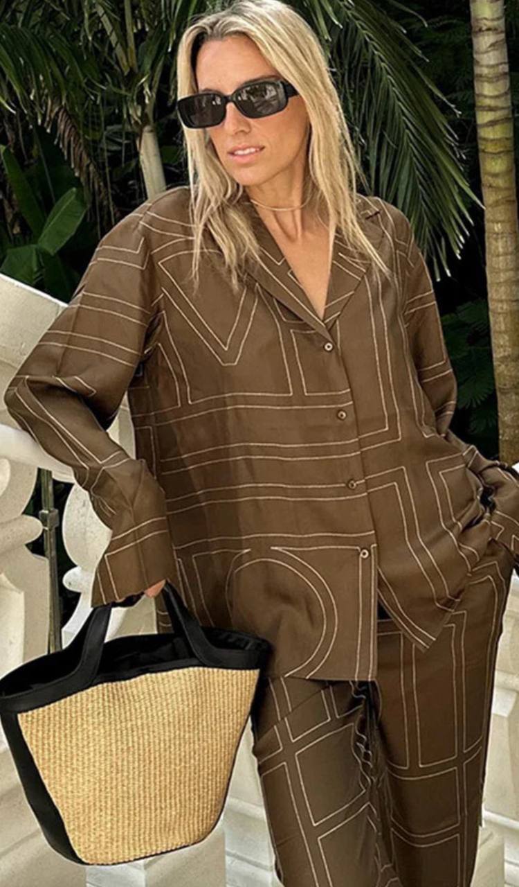 Костюм женский Toteme (LUX-117723) — это элегантный комплект в современном стиле. Он выполнен в коричневом цвете с контрастным узором. Данный костюм идеально подходит для создания как повседневных, так и более нарядных образов.