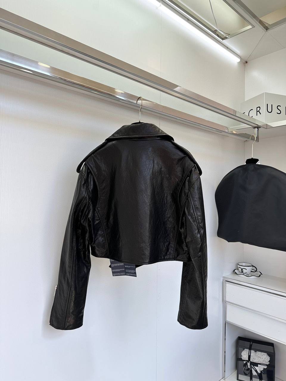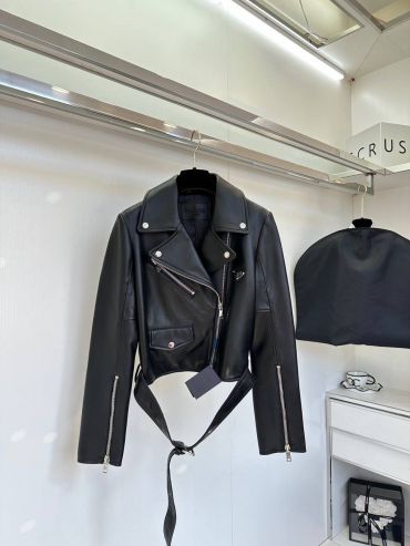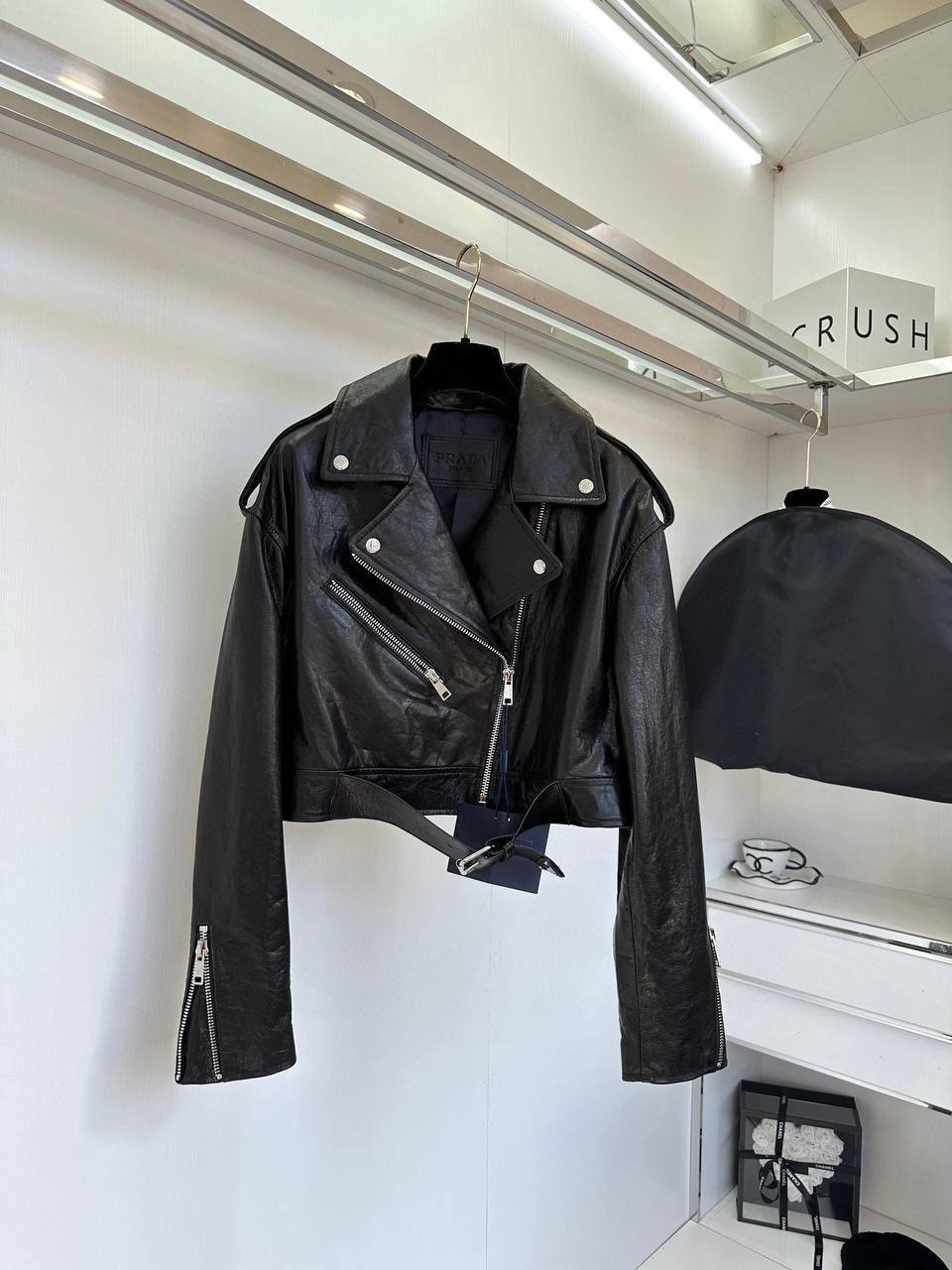 Кожаная куртка LUX-96661 от бренда PRADA, выполнена в стиле косухи, черного цвета. Изделие имеет слегка потертую текстуру и характерный блеск. Эта куртка идеально подходит для создания дерзких и стильных образов.