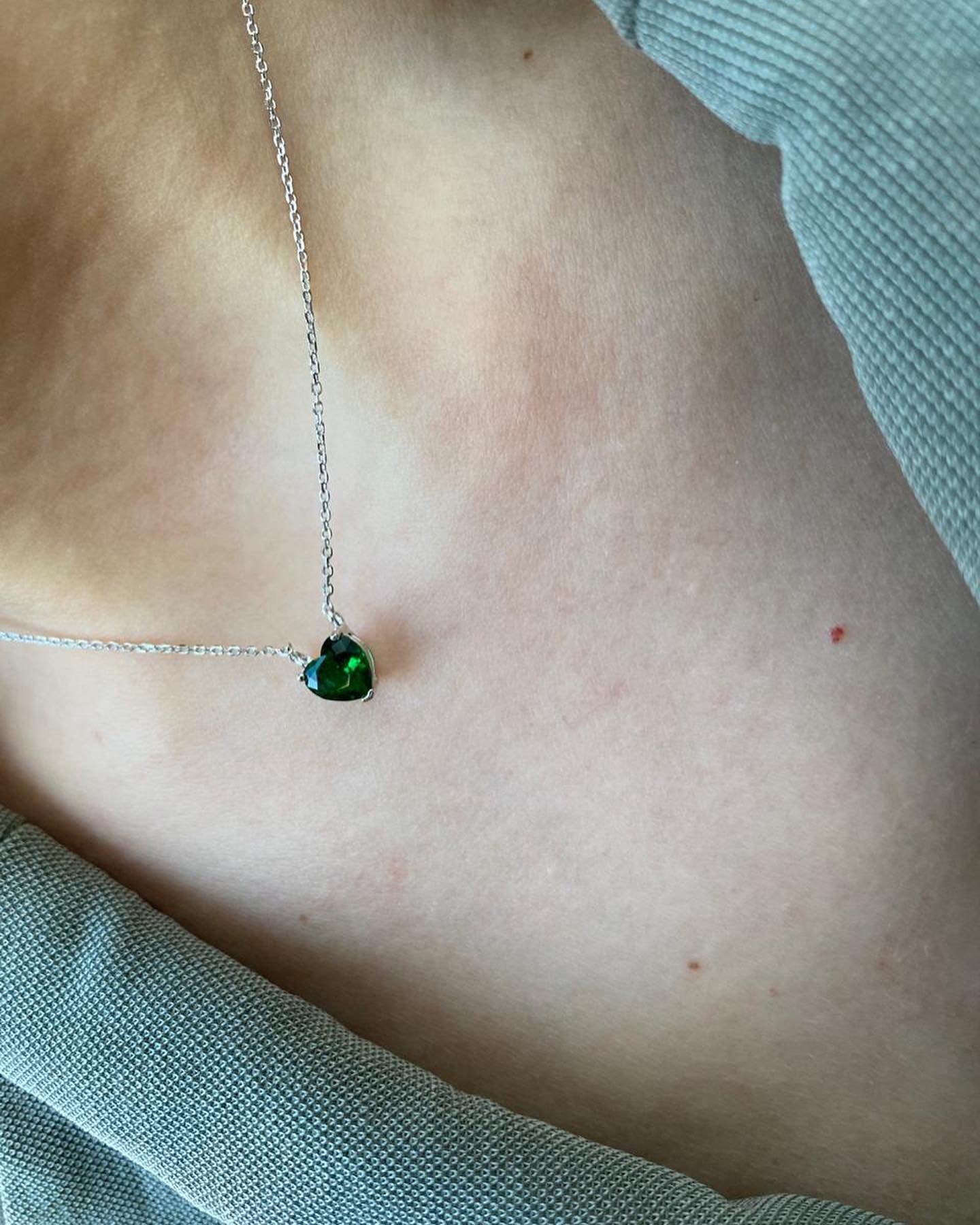 Этот изящный кулон в форме сердца с зеленым камнем, выполненный в современном стиле, станет прекрасным дополнением к любому образу. Лаконичный дизайн и яркий акцент делают его универсальным украшением.