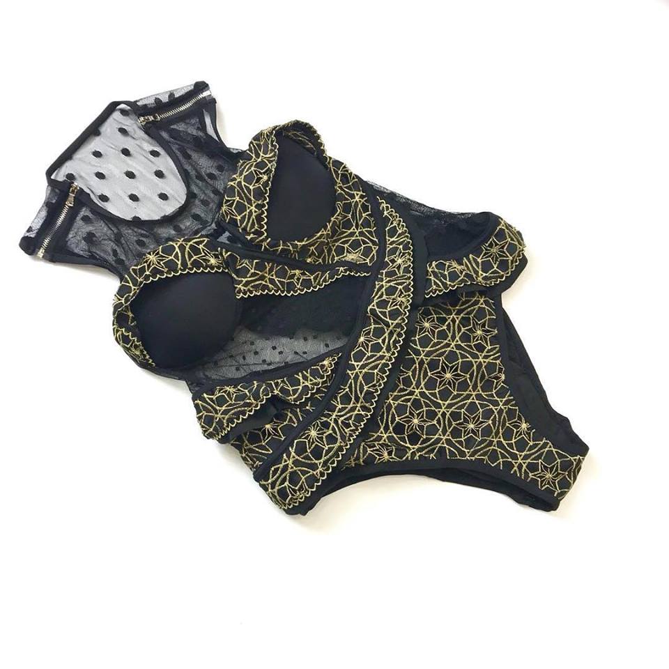 Купальник LUX-10266 — это элегантное и соблазнительное предложение для тех, кто ценит изысканный стиль и высокое качество. Черный цвет купальника дополнен золотистой вышивкой, создающей узор из геометрических фигур и звезд, что придает изделию роскошный вид. Прозрачные вставки из сетки в горошек и декоративные элементы добавляют ему пикантности и оригинальности, подчеркивая индивидуальность.