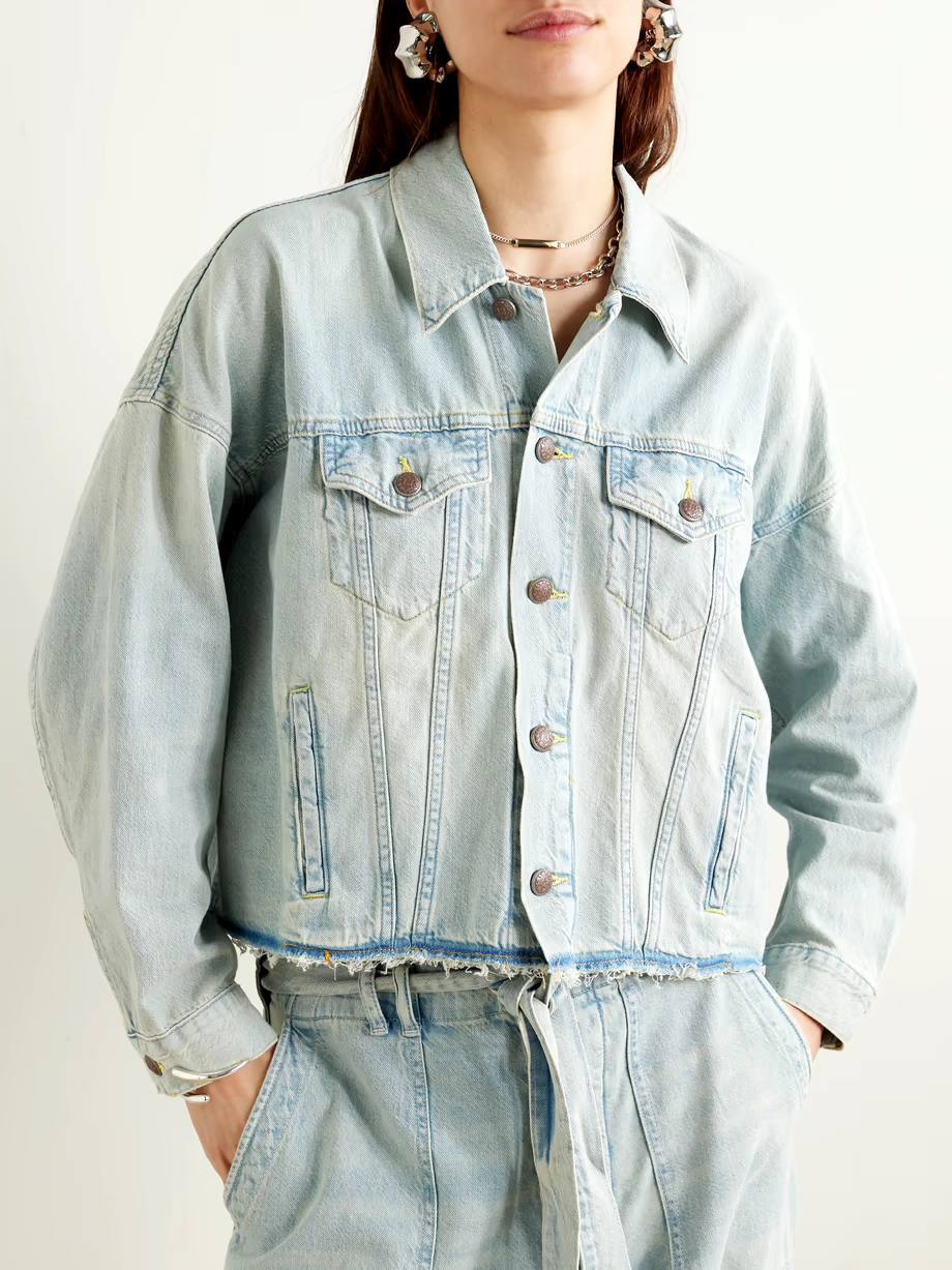 Куртка R13 LUX-107651 представляет собой джинсовую куртку в стиле casual. Куртка выполнена в светло-голубом цвете с текстурой денима и потертостями, которые добавляют винтажный вид. Она подойдет для создания повседневных образов.