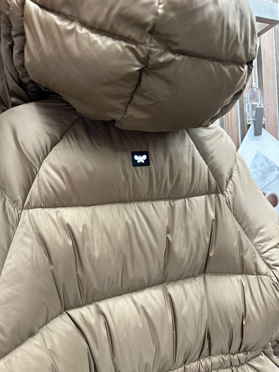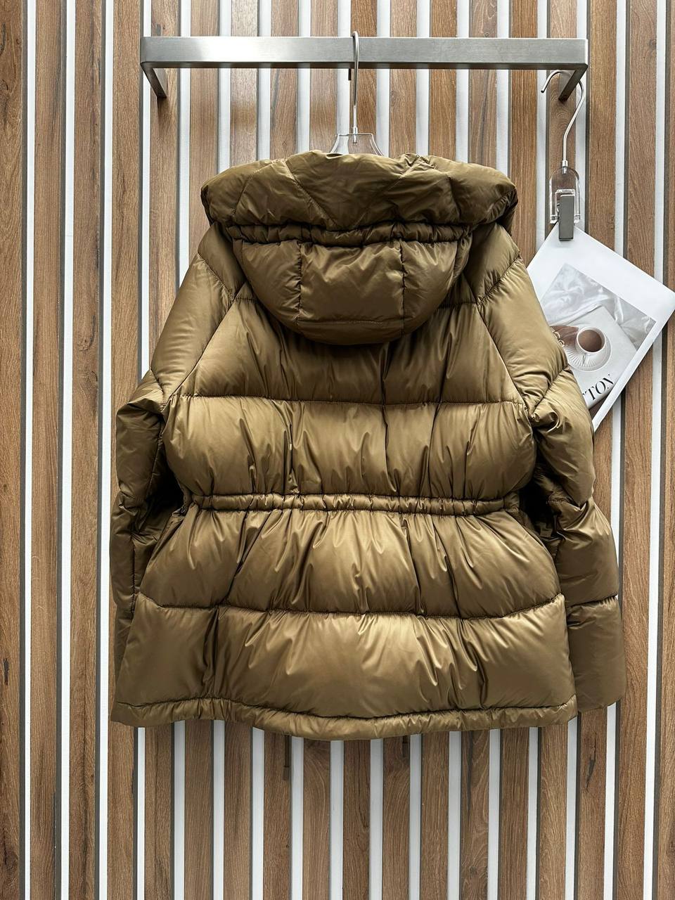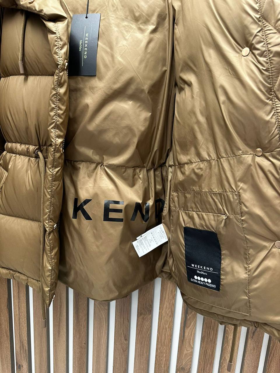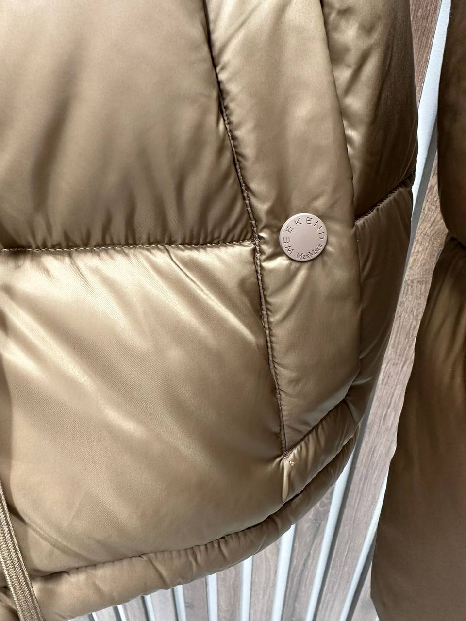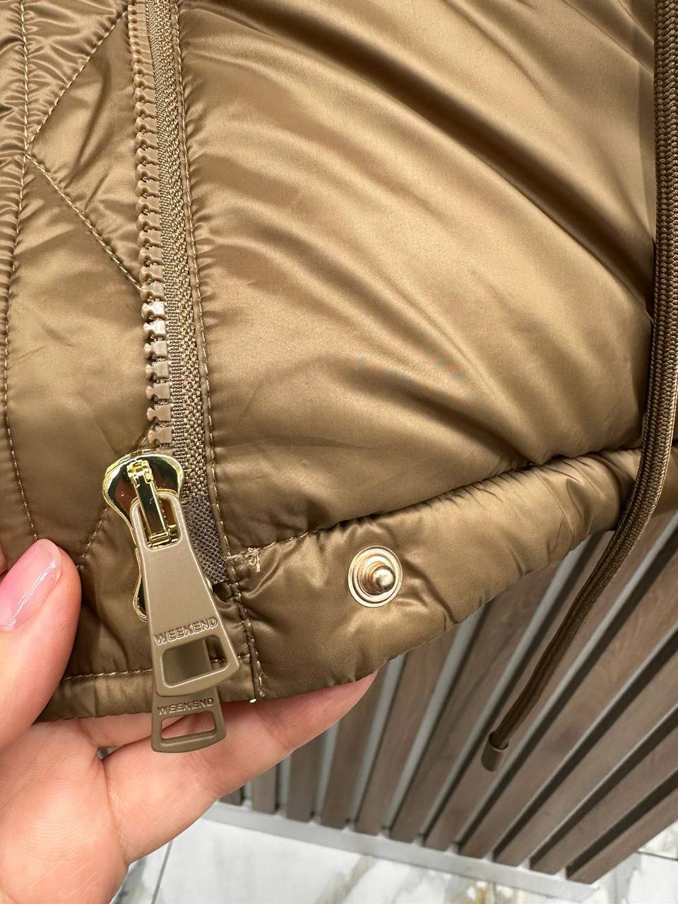 Куртка Weekend LUX-112014 представляет собой стильную верхнюю одежду для холодного времени года. Модель выполнена в приглушенном оттенке золотистого цвета с глянцевой текстурой. Куртка имеет объемный крой, широкий капюшон и регулируемый пояс, что подчеркивает ее современный дизайн и практичность.