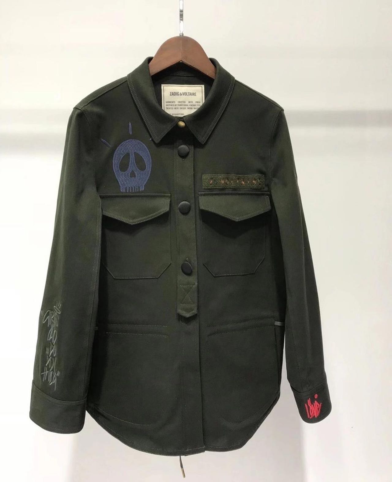 Эта женская куртка от Zadig & Voltaire в стиле милитари отличается эффектным дизайном с принтами черепа и надписью "LOVE". Она идеально подходит для создания стильных повседневных образов, добавляя изюминку к любому наряду. Куртка выполнена с вниманием к деталям, что подчеркивает высокое качество бренда.