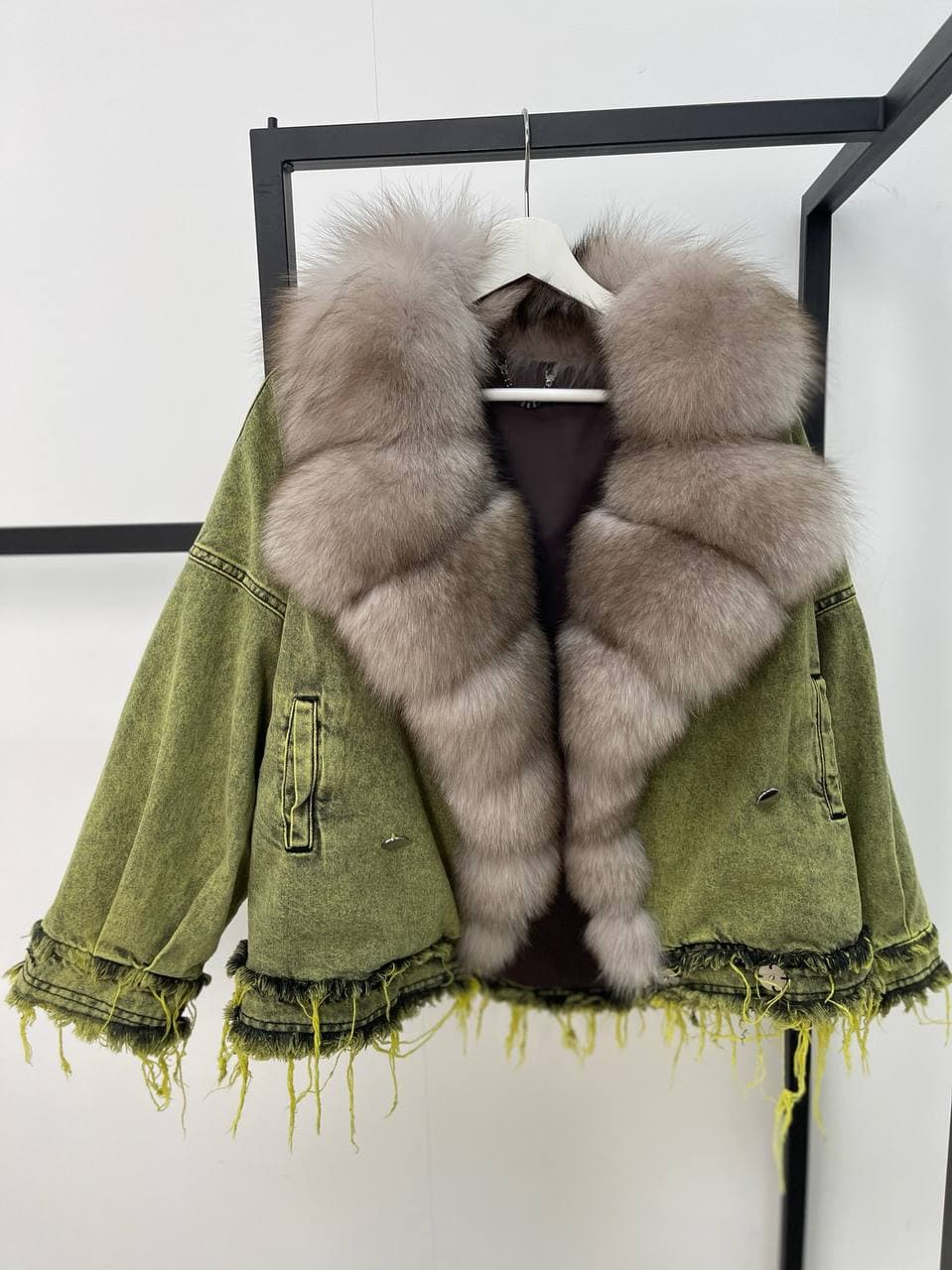 Женская куртка LUX-59471 от LUXE is a statement piece, blending edgy denim with luxurious fur trim. This oversized denim jacket features a striking, oversized collar and cuffs made of fluffy, natural-colored fox fur. The denim itself is washed in a vibrant, acid green hue, with frayed edges and distressed detailing adding to its unique character. The jacket is designed for a relaxed fit, offering both style and comfort.