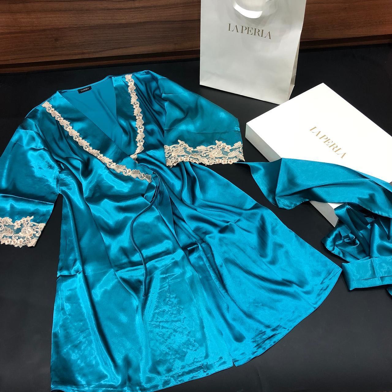 Шелковистый халат La Perla LUX-35497 – воплощение элегантности и комфорта. Этот роскошный предмет гардероба, выполненный в глубоком бирюзовом цвете, украшен изысканным кружевом по краям. Халат идеально подходит для создания расслабленной и утонченной атмосферы дома.