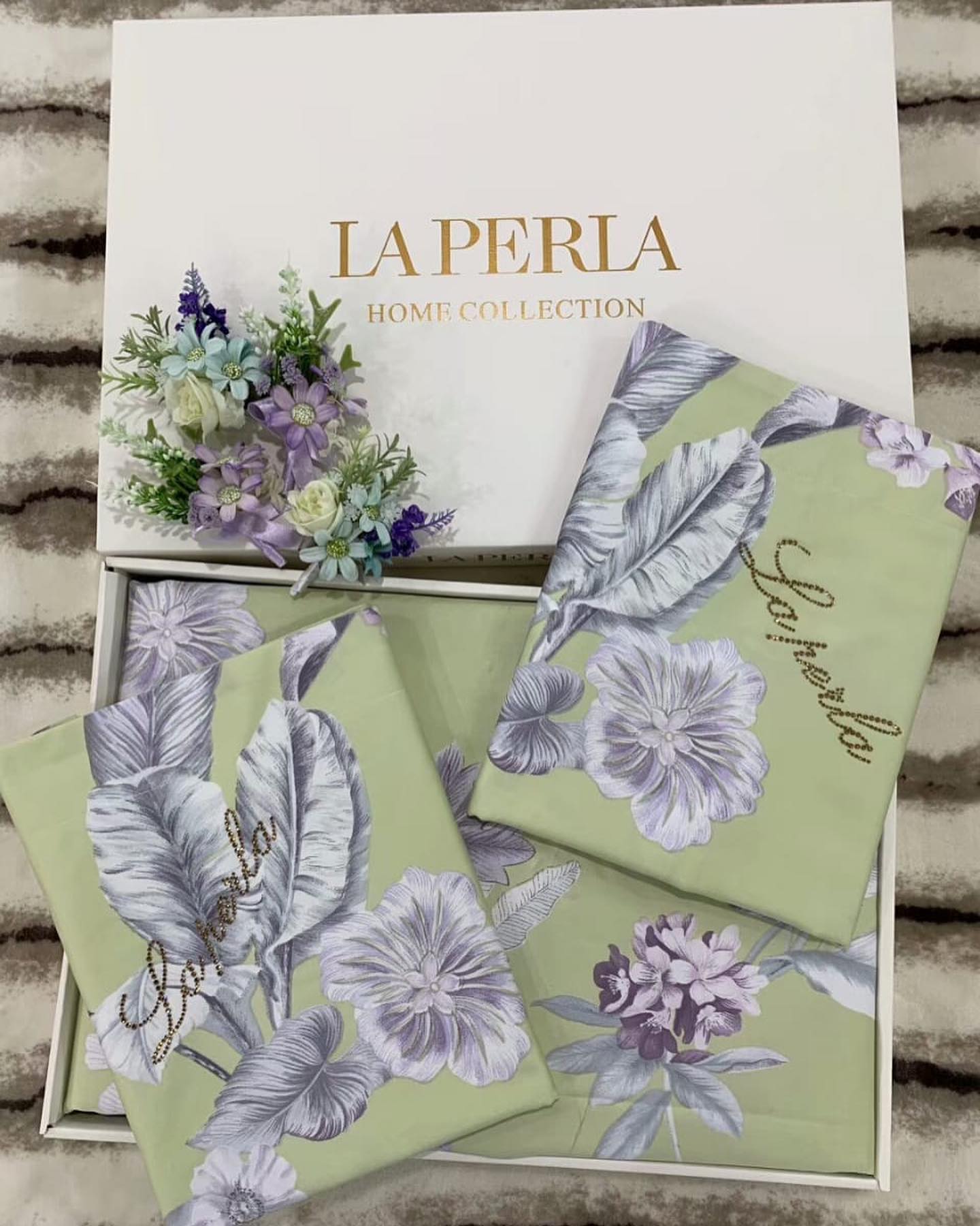 Этот комплект постельного белья La Perla LUX-40904 от La Perla Home Collection представляет собой изысканный выбор для создания уютной и стильной спальни. Дизайн украшен нежным цветочным принтом с листьями и цветами в сиренево-серых тонах на светло-зеленом фоне, дополненный блестящей вышивкой бренда.