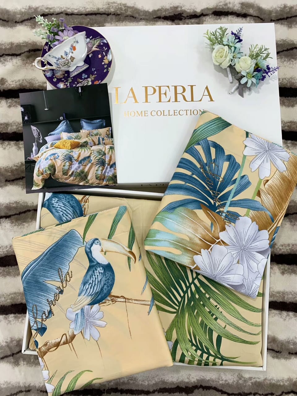 Комплект постельного белья La Perla LUX-24371 представляет собой элегантное решение для спальни, выполненное в тропическом стиле. Набивной рисунок с изображением экзотических птиц, пальмовых листьев и цветов создает атмосферу уюта и роскоши. Высококачественные материалы обеспечивают комфортный сон.