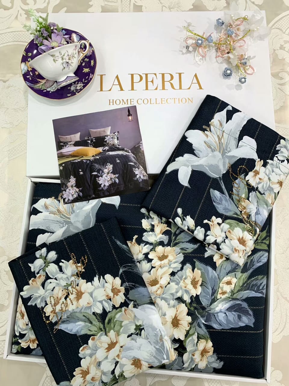 Комплект постельного белья La Perla LUX-25821 представляет собой изысканное дополнение к вашему интерьеру. Глубокий синий фон эффектно контрастирует с пышными, реалистичными цветочными узорами, создавая атмосферу роскоши и утонченности. Этот комплект из коллекции La Perla Home Collection способен преобразить вашу спальню, добавив ей элегантности и особого шарма.