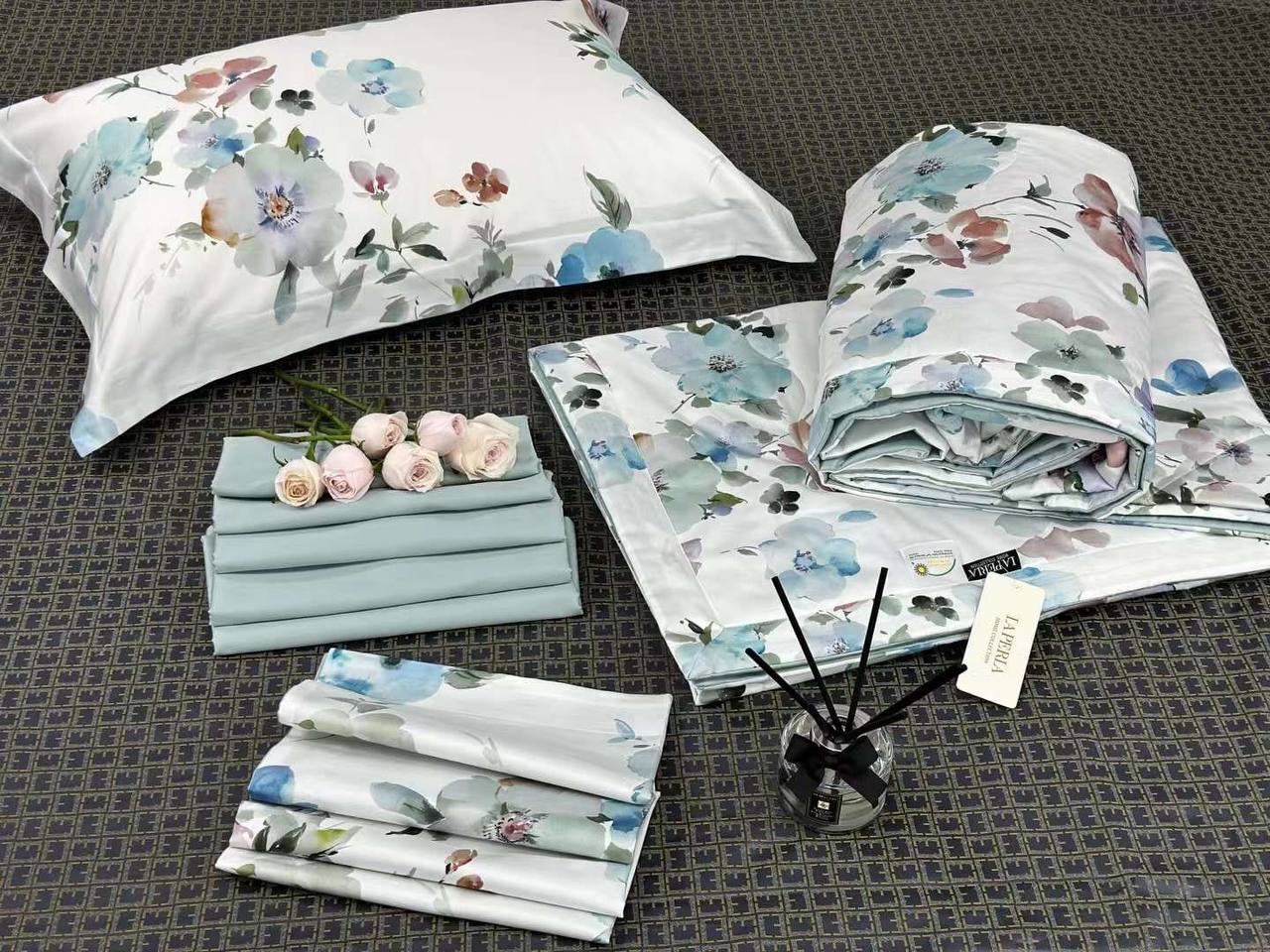 Комплект постельного белья La Perla LUX-90144 — это изысканный текстиль для спальни, выполненный в нежных тонах с цветочным принтом. Комплект включает в себя наволочки, простынь и пододеяльник. Его можно использовать для создания уютной и стильной атмосферы в спальне.