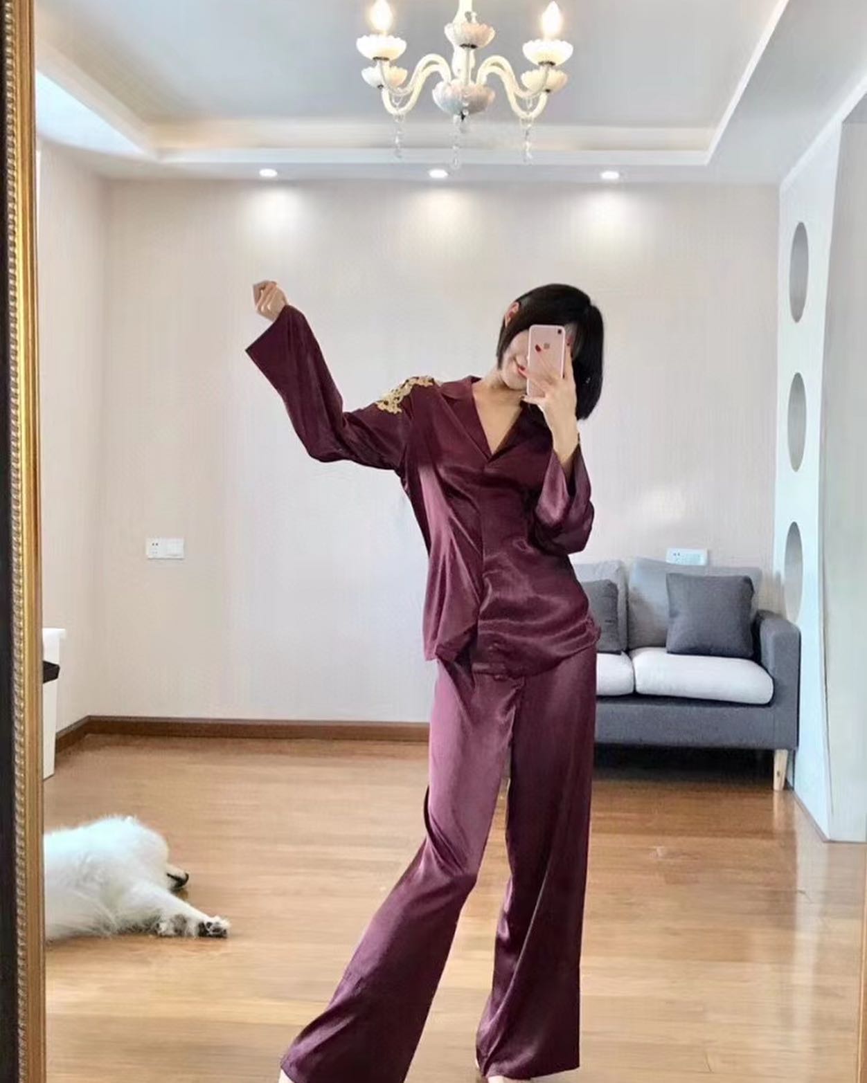 Эта элегантная пижама La Perla LUX-34602 выполнена в глубоком винном оттенке и отличается утонченным дизайном. Комплект состоит из рубашки с отложным воротником и прямых брюк, создавая образ роскошного домашнего костюма. Деликатная золотистая вышивка на плече добавляет изысканности и подчеркивает премиальное качество.