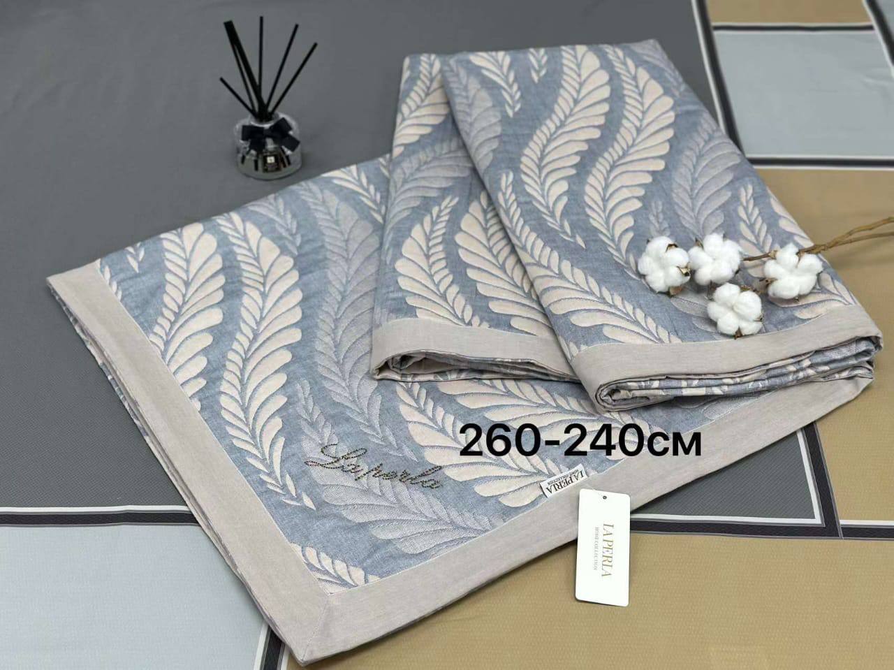 Покрывало La Perla LUX-90111 представляет собой изысканное изделие с нежным узором в виде листьев и изысканным дизайном. Покрывало выполнено в спокойных оттенках, создавая атмосферу уюта и комфорта в спальне.