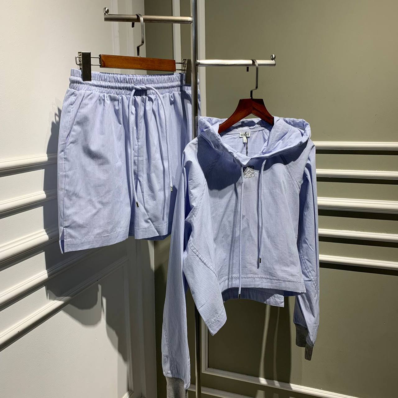 Костюм Loewe LUX-72323 - это стильный комплект из коллекции Loewe, выполненный в повседневном стиле. Костюм состоит из худи с капюшоном и шорт, выполненных в сине-белую полоску. Этот костюм идеально подходит для создания комфортного и модного образа.