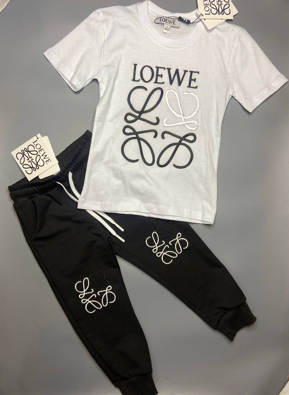 Костюм Loewe LUX-103045 - это стильный комплект одежды, состоящий из футболки и брюк. Дизайн костюма выполнен в спортивном стиле с акцентом на минимализм и узнаваемый логотип. Комплект представлен в классическом сочетании цветов: белый верх и черные брюки.