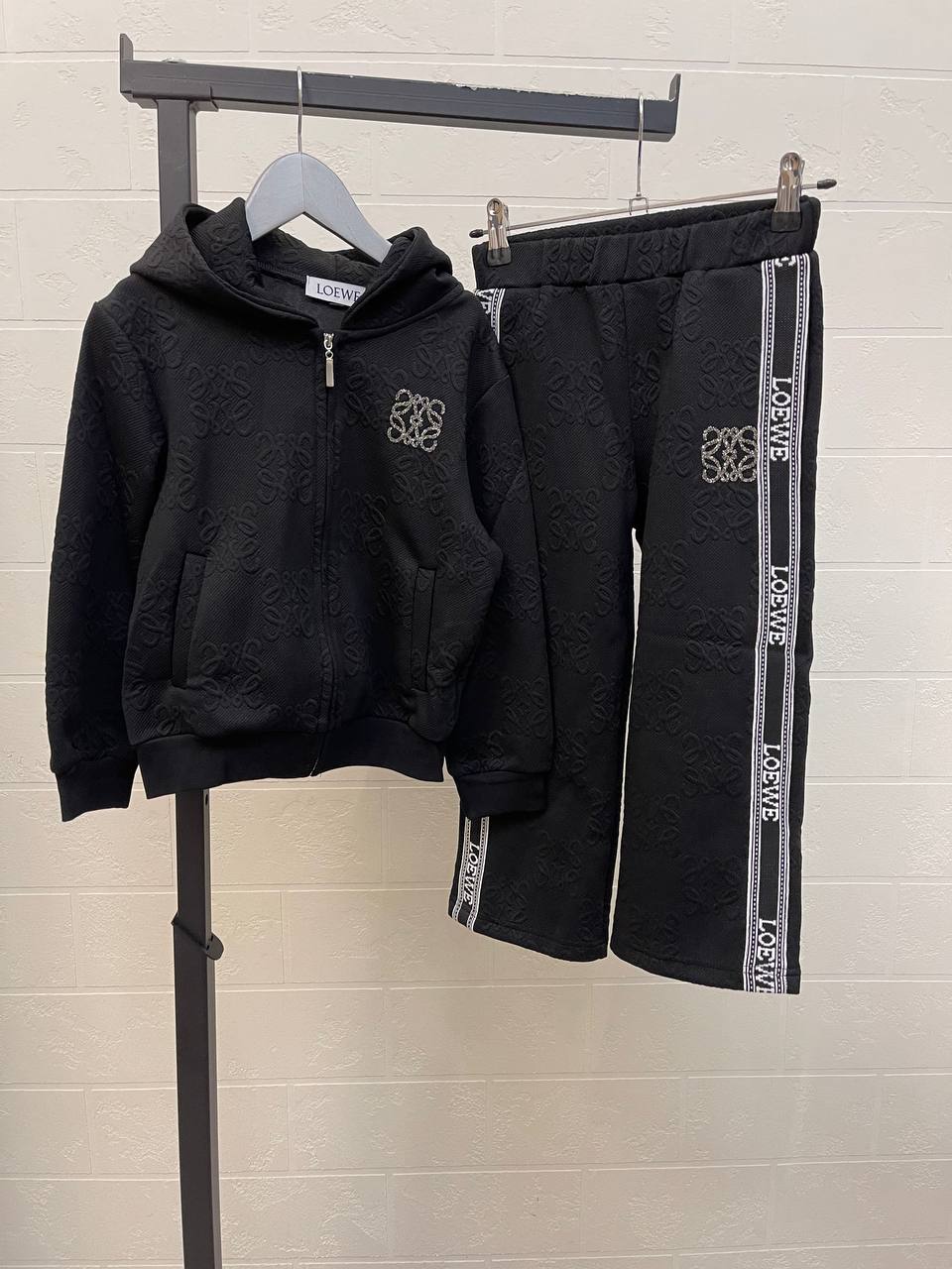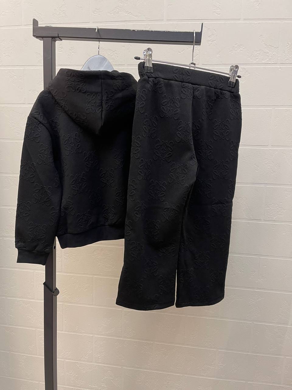 Спортивный костюм Loewe LUX-110238 — это стильный и комфортный ансамбль для повседневной носки. Костюм выполнен в черном цвете с текстурированным узором по всей поверхности и контрастными полосами с логотипом на брюках. Этот костюм сочетает в себе спортивный стиль и элегантность, что делает его отличным выбором для создания модных образов.
